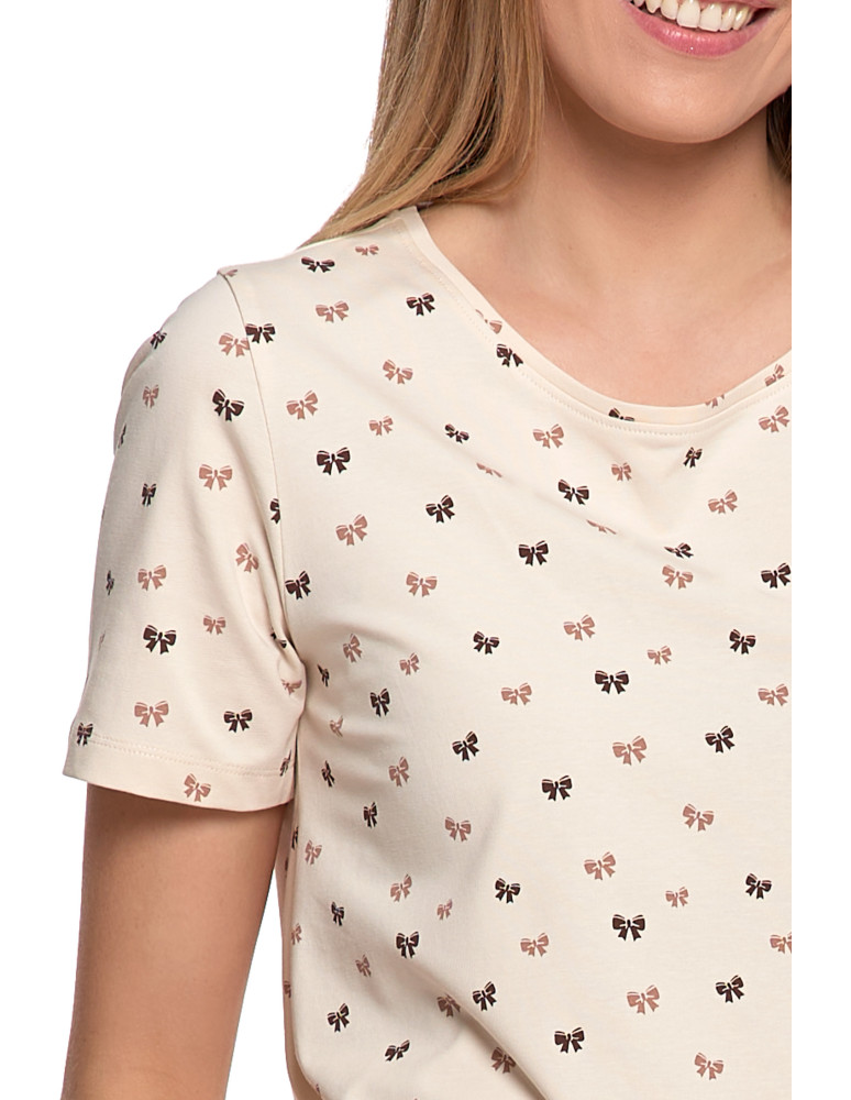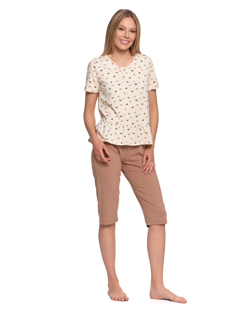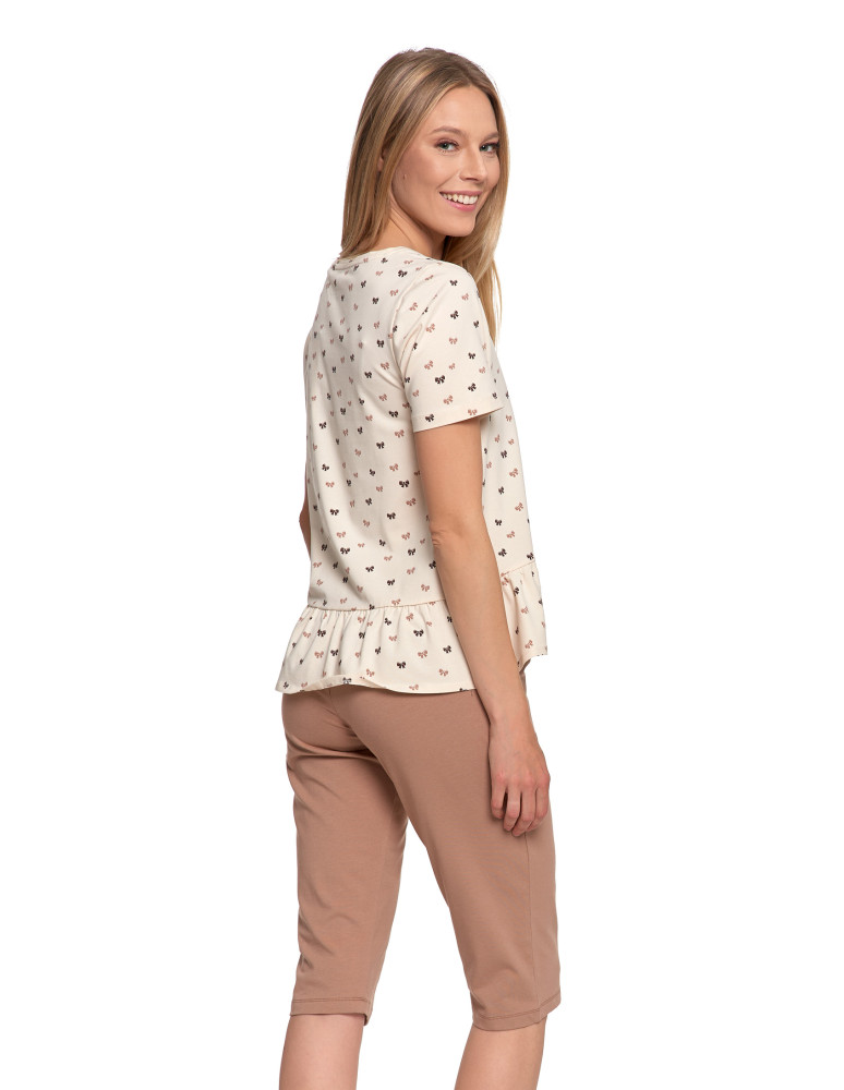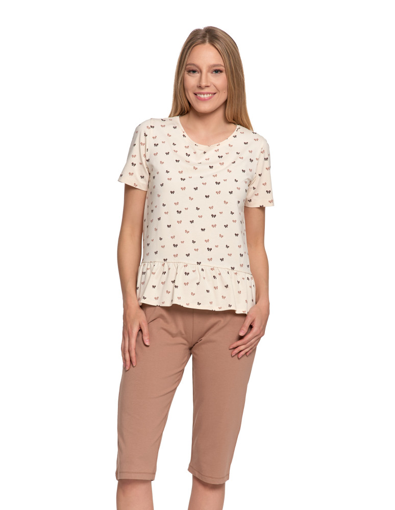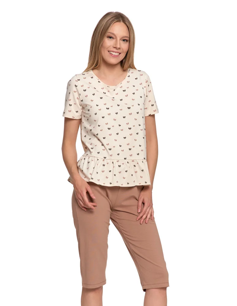 Dwuczęściowa piżama damska w subtelnym, beżowym kolorze, ozdobiona drobnym wzorem uroczych kokardek. Góra z krótkim rękawem i ozdobną falbaną na dole nadaje całości dziewczęcego uroku. Spodenki o długości 3/4 w jednolitym, karmelowym odcieniu, z elastyczną talią zapewniającą wygodę. Całość uszyta z przyjemnej w dotyku bawełny z dodatkiem elastanu - materiał miękko układa się na ciele i nie krępuje ruchów.
