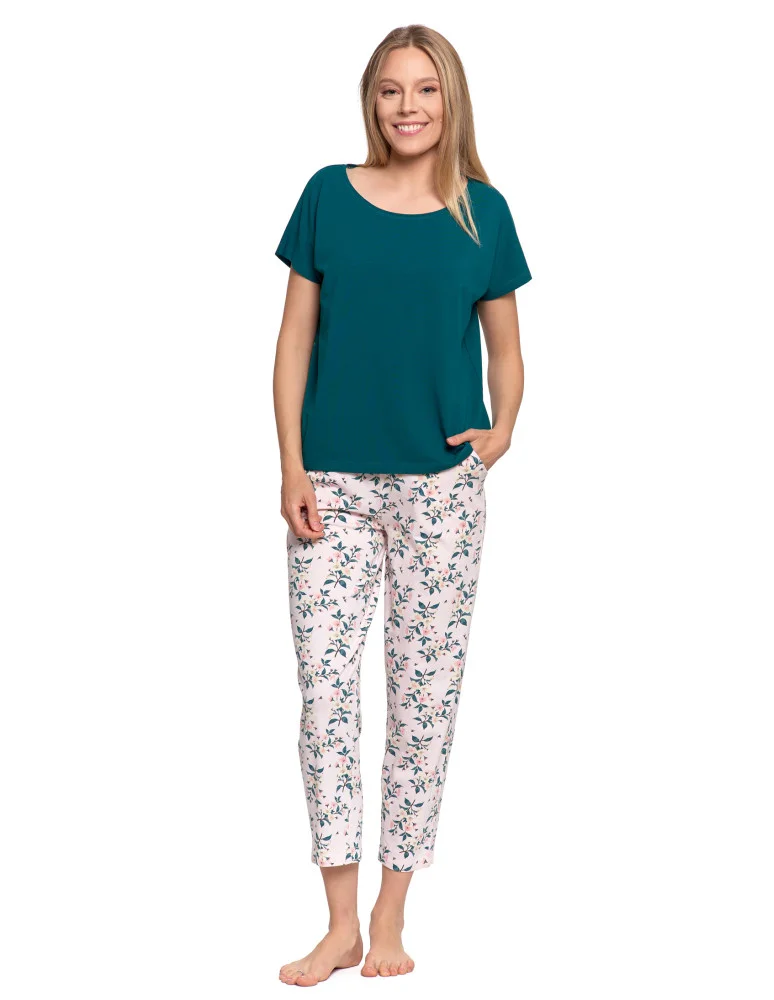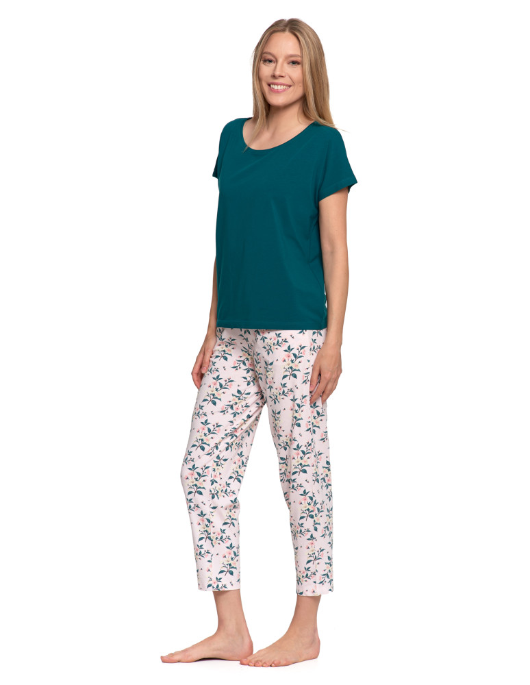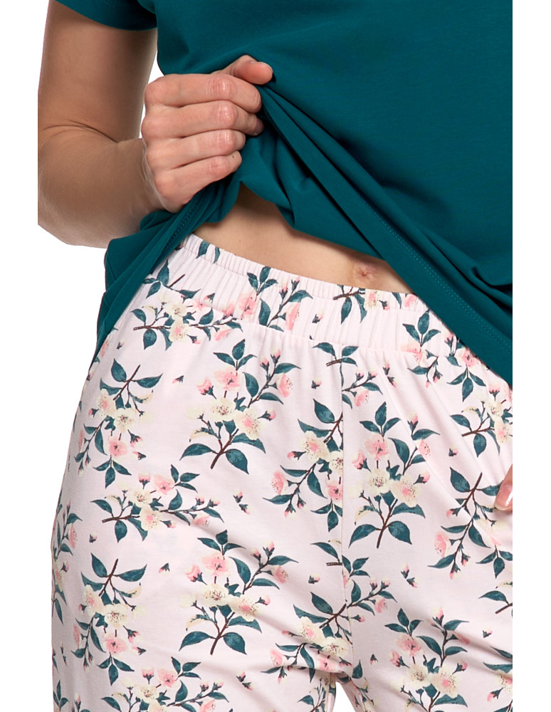 Piżama damska bawełniana z krótkim rękawem i kwiatowym wzorem ZIELONY