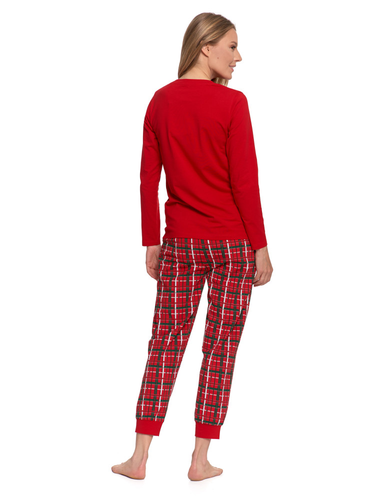 Wprowadź się w świąteczny nastrój dzięki uroczej, damskiej piżamie z nadrukiem pierniczka! Góra w intensywnie czerwonym kolorze, z długim rękawem i zabawnym nadrukiem świątecznym, idealnie wpisuje się w klimat zimowych wieczorów. Spodnie w klasyczną czerwoną kratę z zielonym i białym akcentem, zakończone miękkimi ściągaczami, dodają całości charakteru i wygody.
