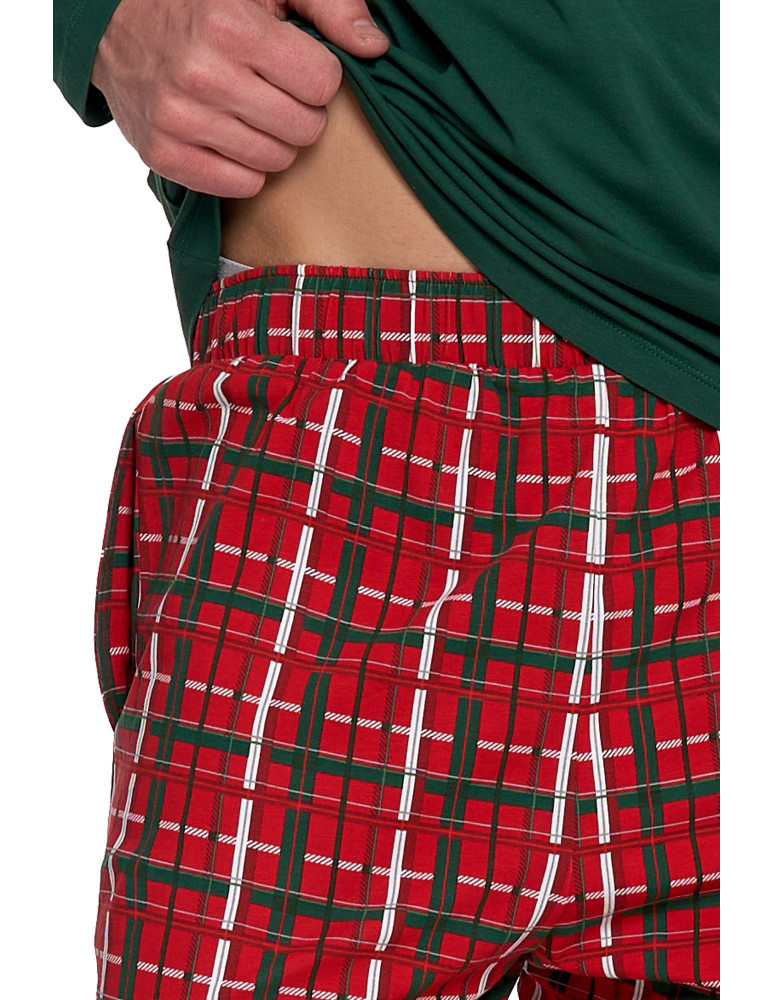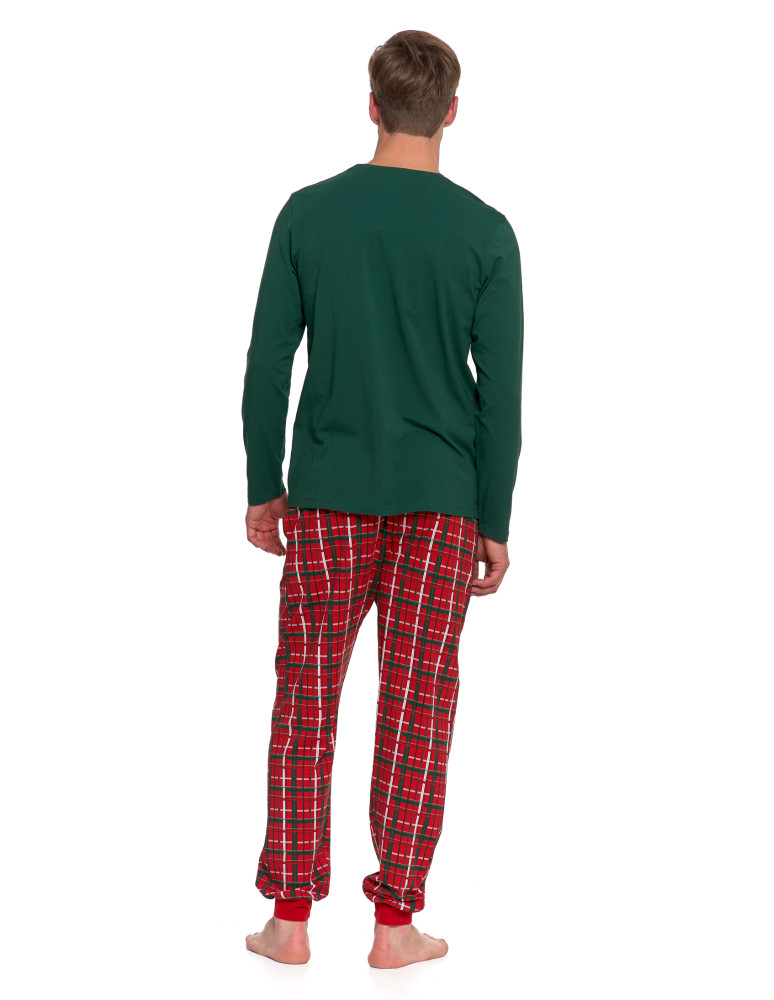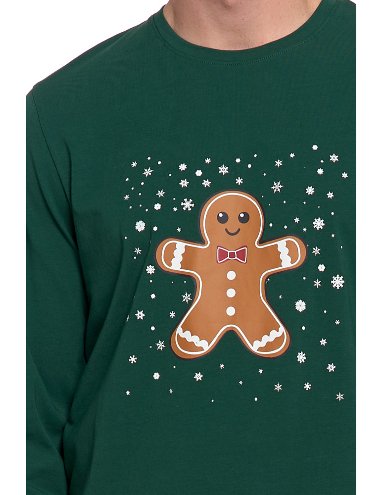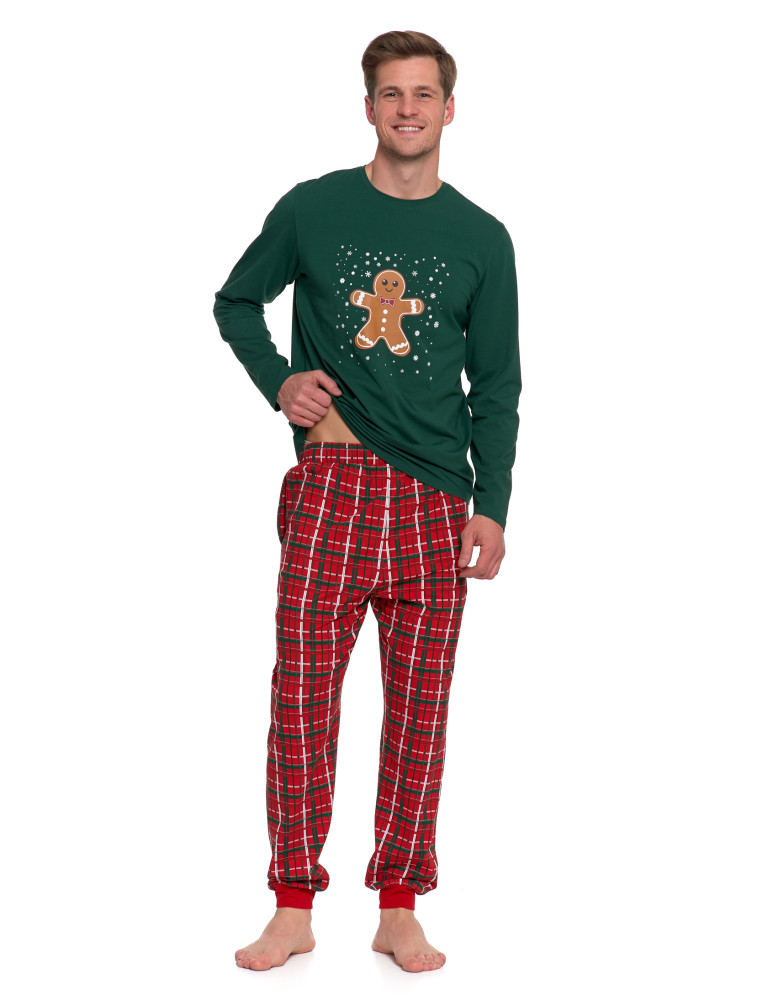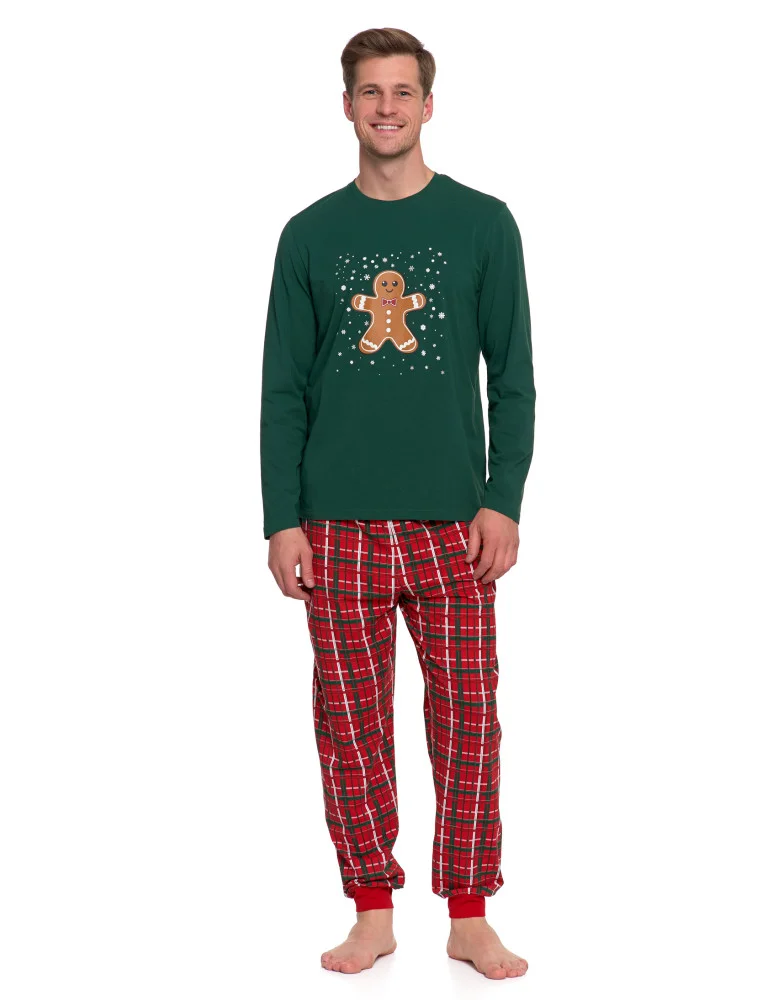 Wygodna, świąteczna piżama męska z długim rękawem wykonana z miękkiej bawełny. Góra w głębokim odcieniu zieleni ozdobiona jest uroczym nadrukiem piernikowego ludzika, otoczonego śnieżynkami - to subtelne nawiązanie do zimowego klimatu i bożonarodzeniowej atmosfery. Spodnie w klasyczną czerwoną kratę z elastycznym pasem i wygodnymi ściągaczami u dołu świetnie komponują się z górą zestawu.