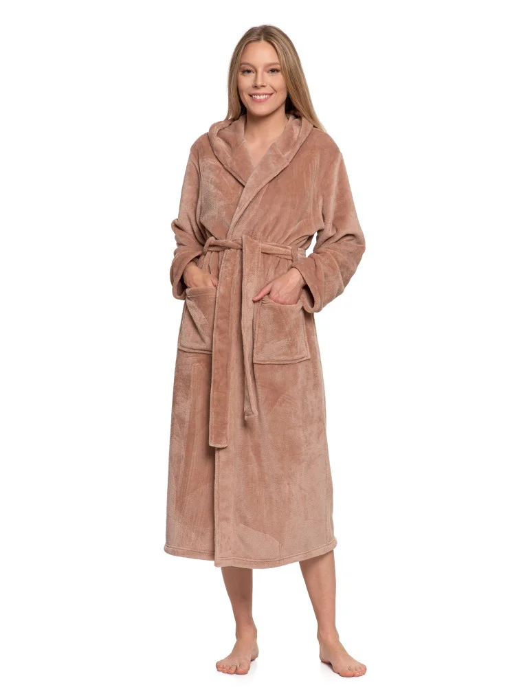 Szlafrok ciepły damski długi z kapturem BEŻOWY