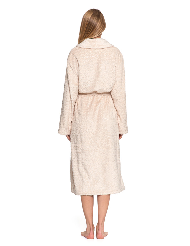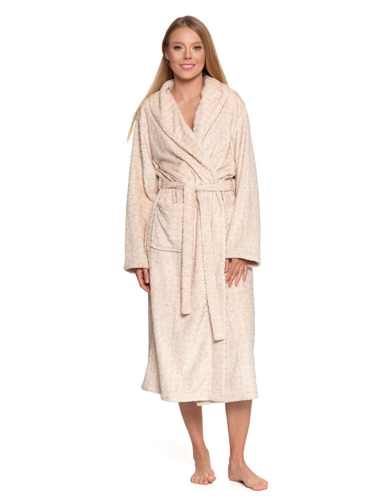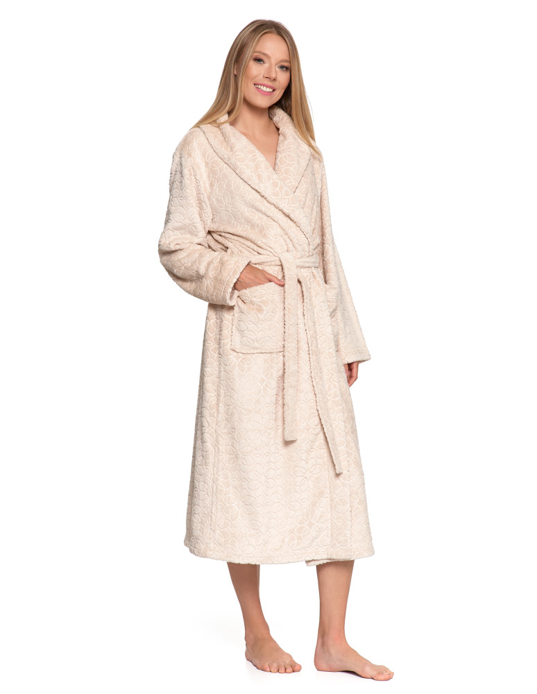 Odkryj wyjątkowy komfort z naszym luksusowym szlafrokiem damskim. Wykonany z niezwykle miękkiego, puszystego materiału, który delikatnie otula ciało i zapewnia ciepło w chłodniejsze dni. Długi fason z paskiem do wiązania w talii gwarantuje idealne dopasowanie, a tłoczony, elegancki wzór dodaje szlafrokowi wyjątkowego charakteru.