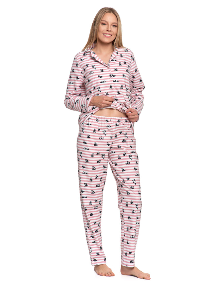Przyjemna w dotyku piżama damska uszyta z miękkiej, naturalnej flaneli z 100% bawełny. Klasyczny regularny krój z koszulą zapinaną na guziki i długimi rękawami zapewnia pełen komfort noszenia, a spodnie z elastyczną gumką w pasie gwarantują swobodę ruchów. Całość zdobi różowo-białe paski z uroczym wzorem pand, które dodają piżamie lekkiego, dziewczęcego charakteru. Idealna na chłodniejsze noce. Ta piżama damska z flaneli zapewni ciepło, wygodę i przytulność przez cały sen.
