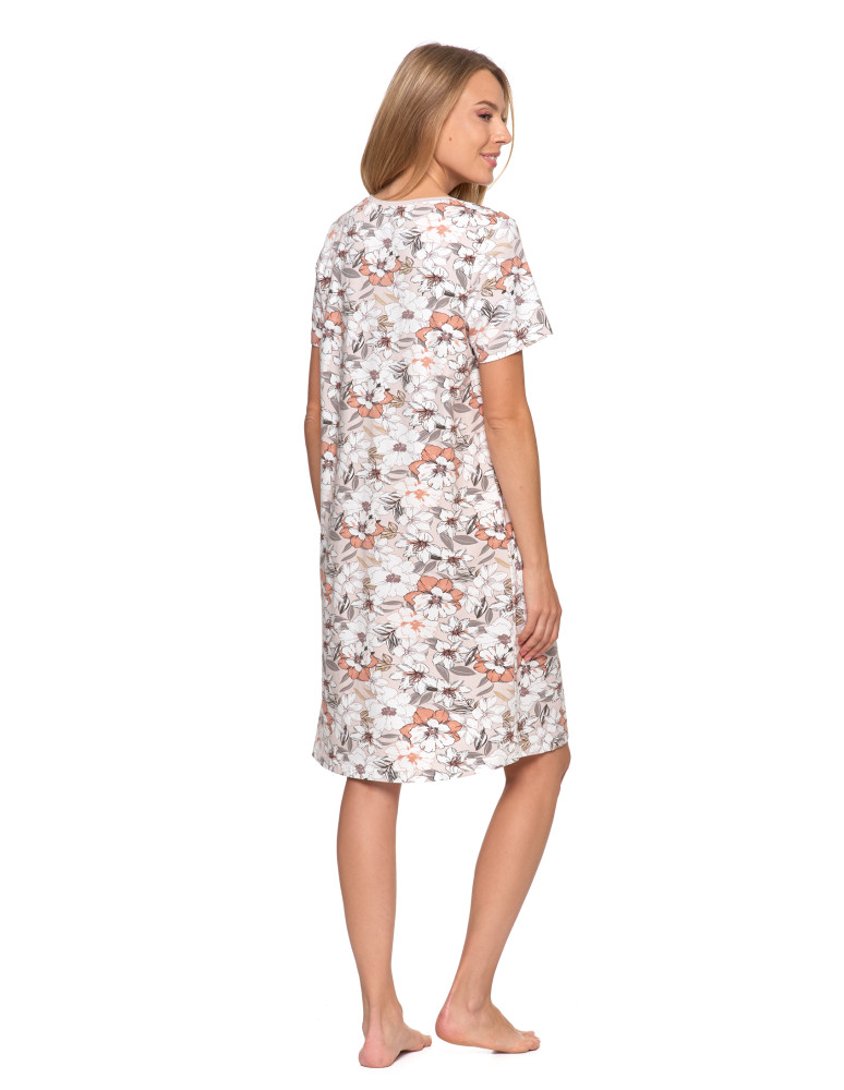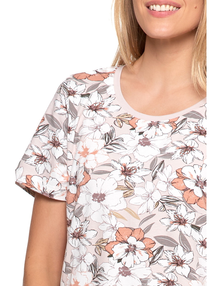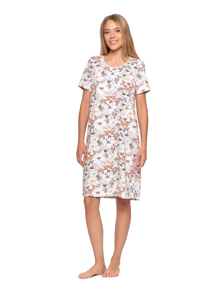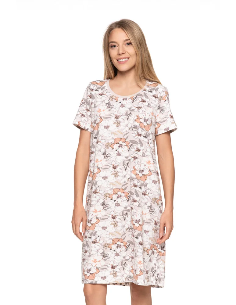 Koszula nocna damska bawełniana krótki rękaw w kwiaty KREMOWY