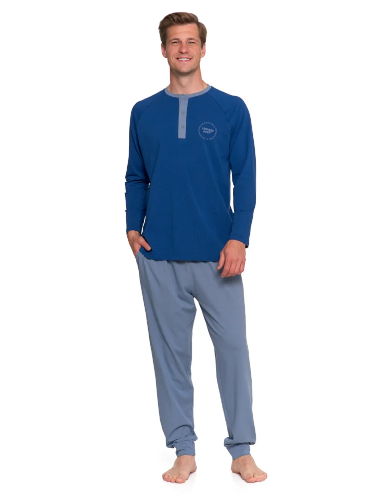 Piżama męska bawełniana z długim rękawem i spodniami GRANATOWY