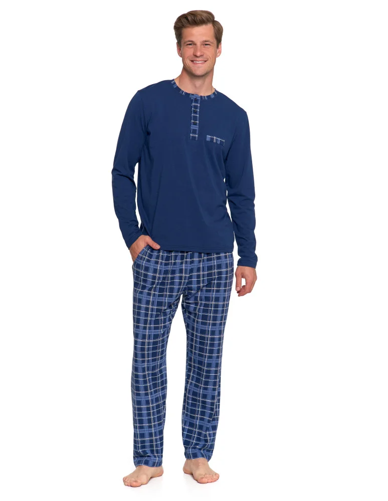 Piżama męska bawełniana z długim rękawem spodnie kratka GRANATOWY