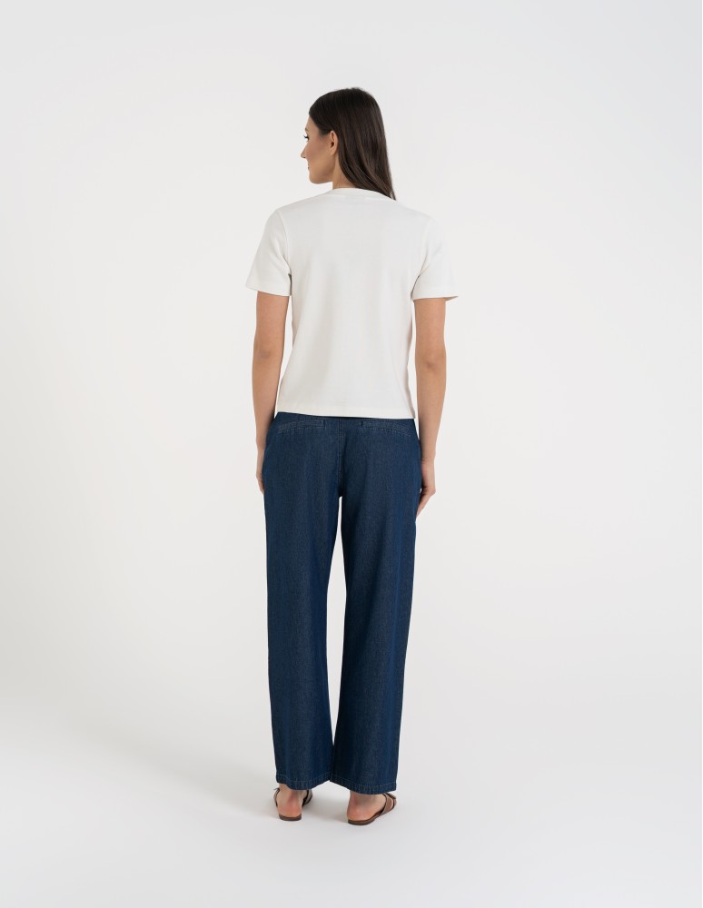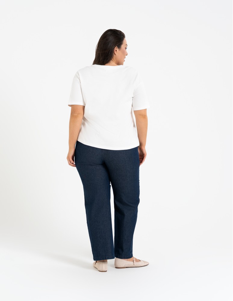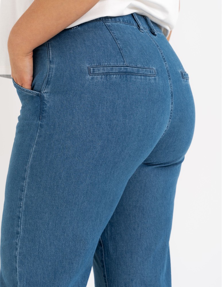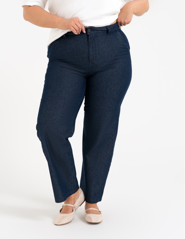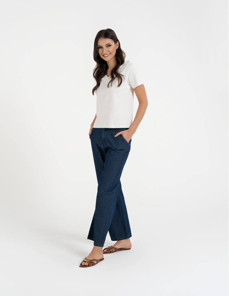 Wysoki stan podkreśla talię i optycznie modeluje sylwetkę, zapewniając jednocześnie stabilne dopasowanie. Zapięcie na guzik i zamek błyskawiczny gwarantuje wygodę użytkowania oraz klasyczny wygląd.