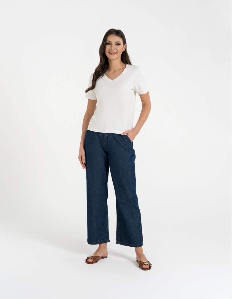Spodnie damskie wykonane z cienkiego jeansu to wygodna i uniwersalna propozycja na co dzień. Model w kroju regular dobrze dopasowuje się do sylwetki, zapewniając komfort noszenia i swobodę ruchów.