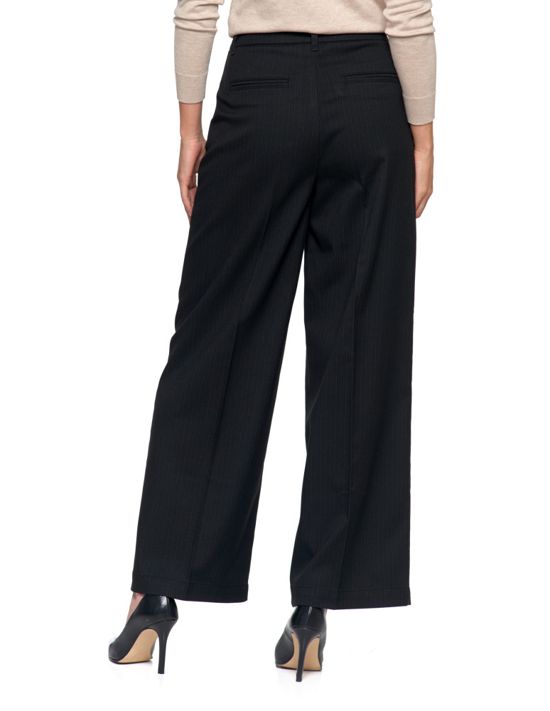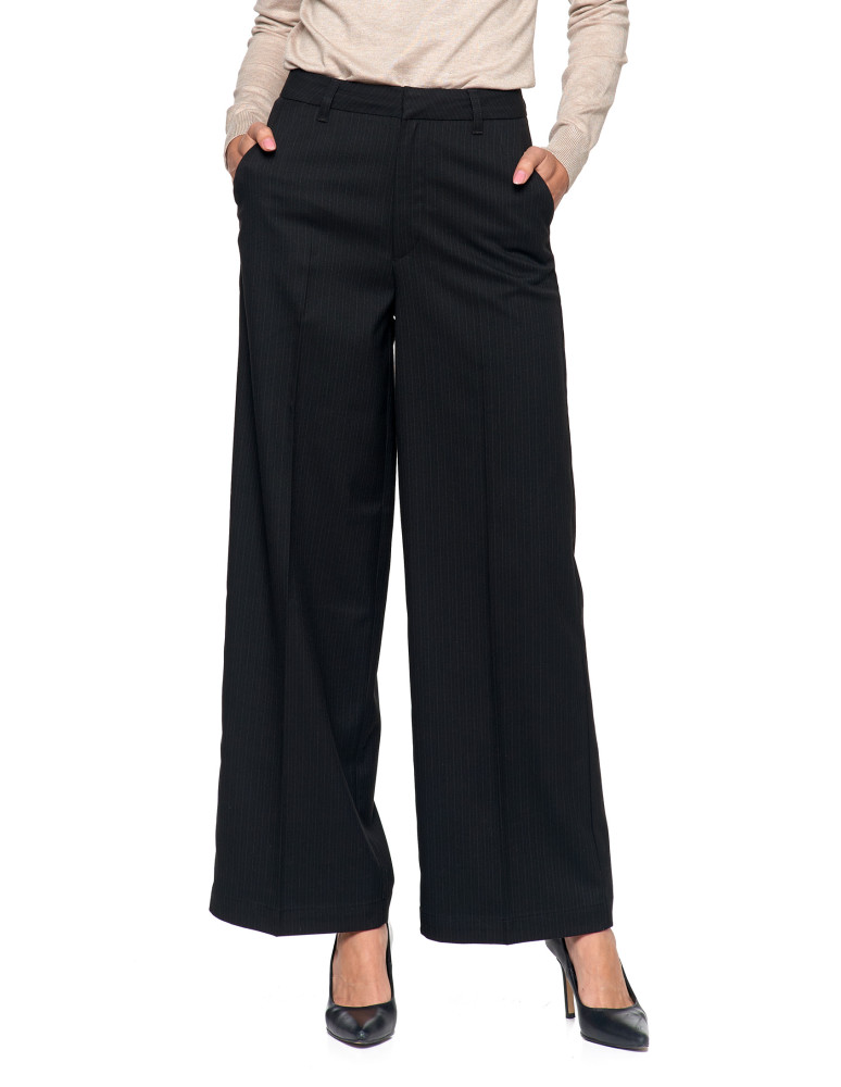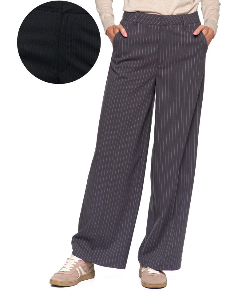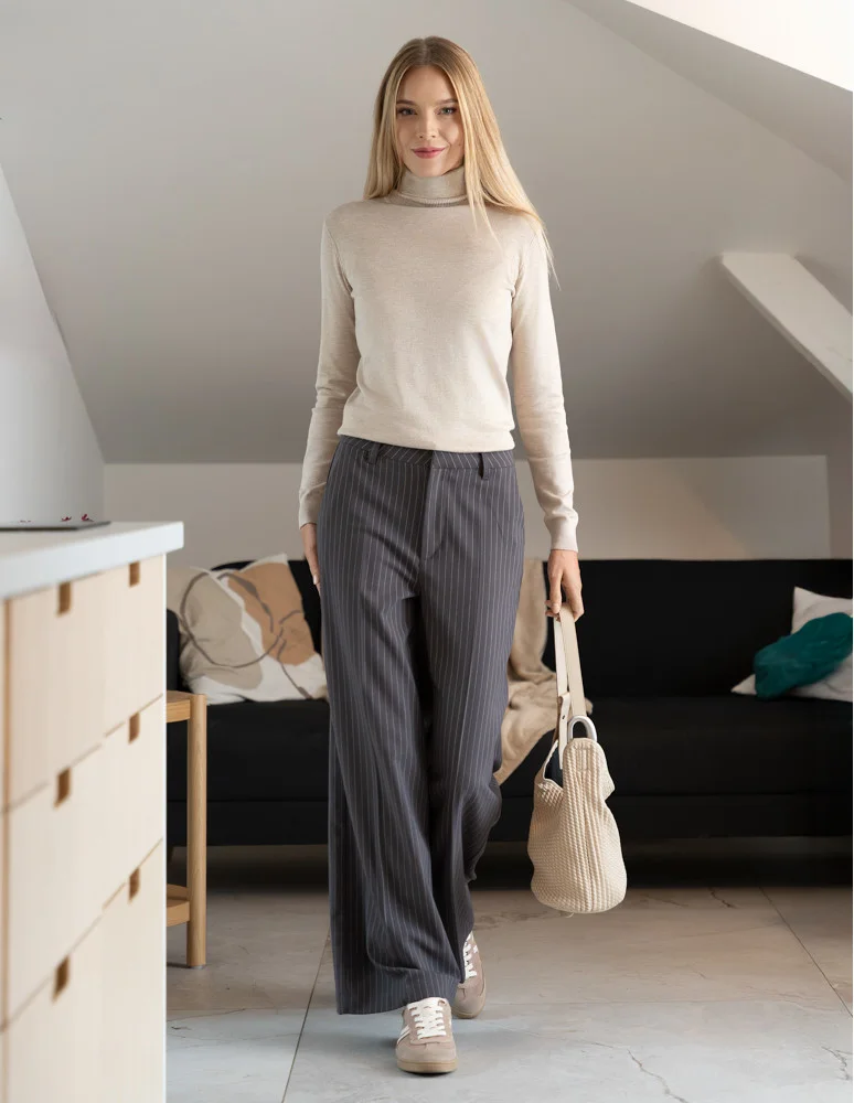 Model wyróżnia się prostotą formy oraz subtelnym wzorem w prążek, który dodaje całości wyrafinowanego charakteru. Dzięki klasycznej kolorystyce spodnie można łatwo dopasować do wielu stylizacji – od białej koszuli, przez golf, po luźny T-shirt. Szerokie nogawki optycznie wydłużają nogi, a zaprasowany kant nadaje całości elegancji.