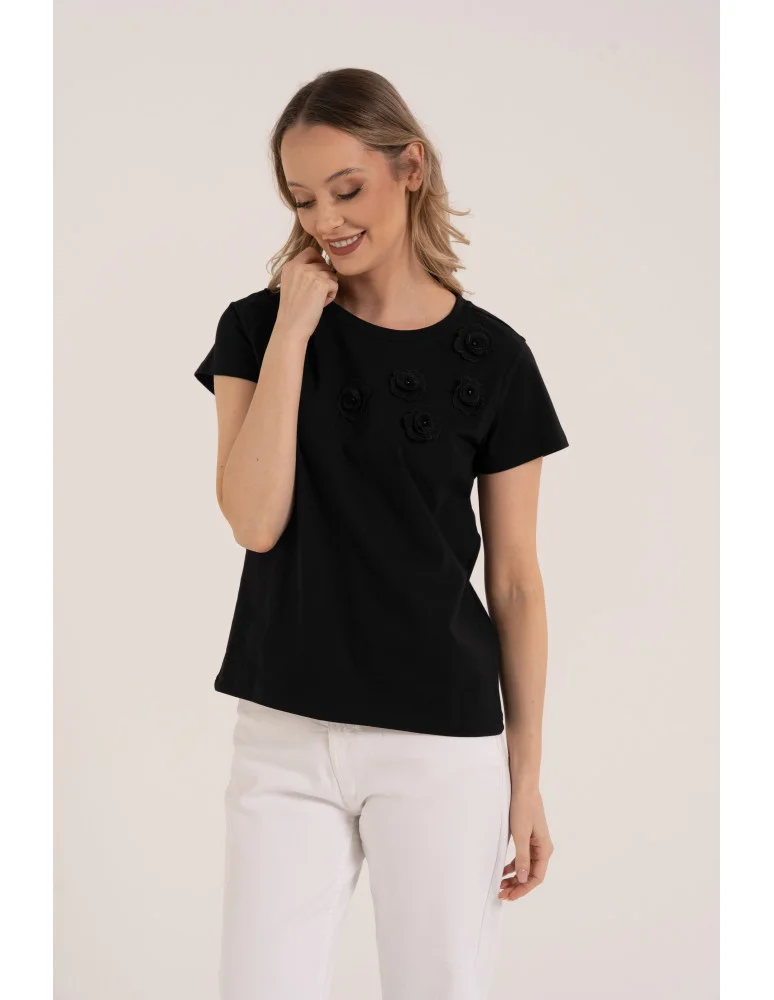 Bluzka damska bawełniana z krótkim rękawem i aplikacją 3D kwiatów CZARNY