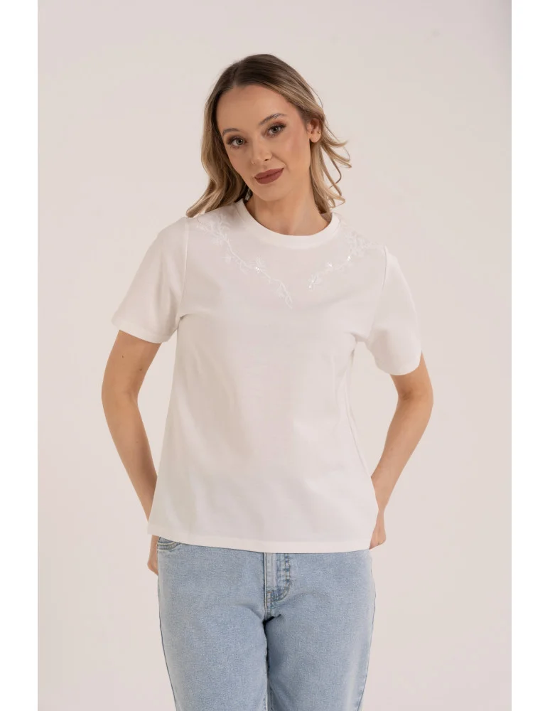 Bluzka damska z krótkim rękawem bawełniana i cekinami BIAŁY