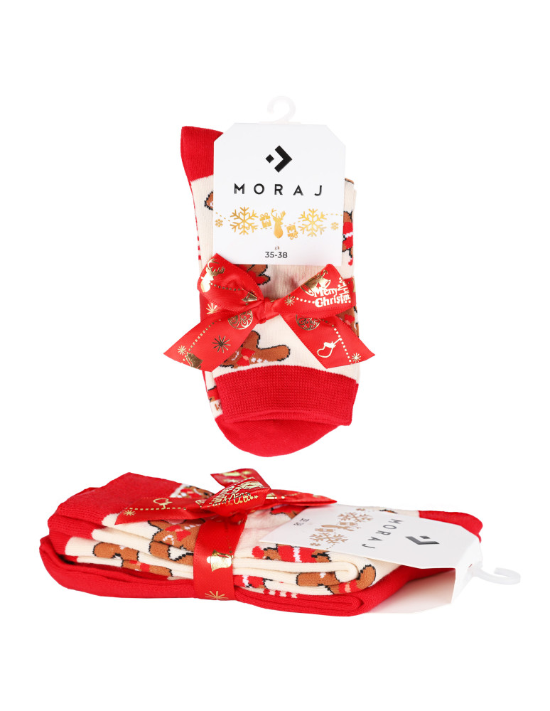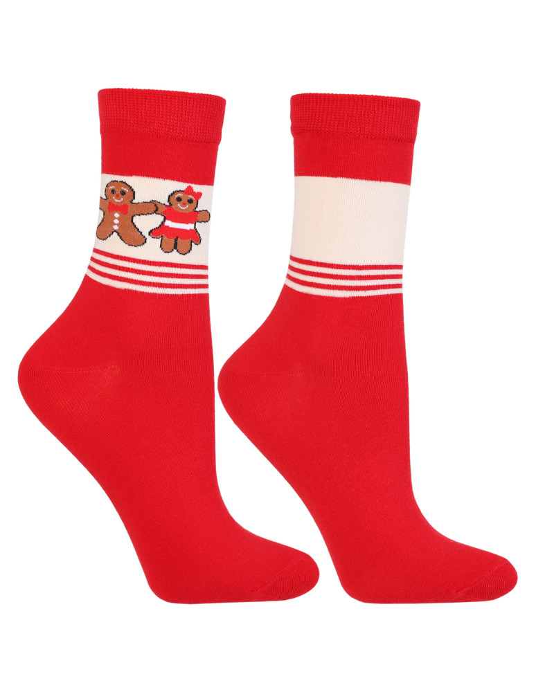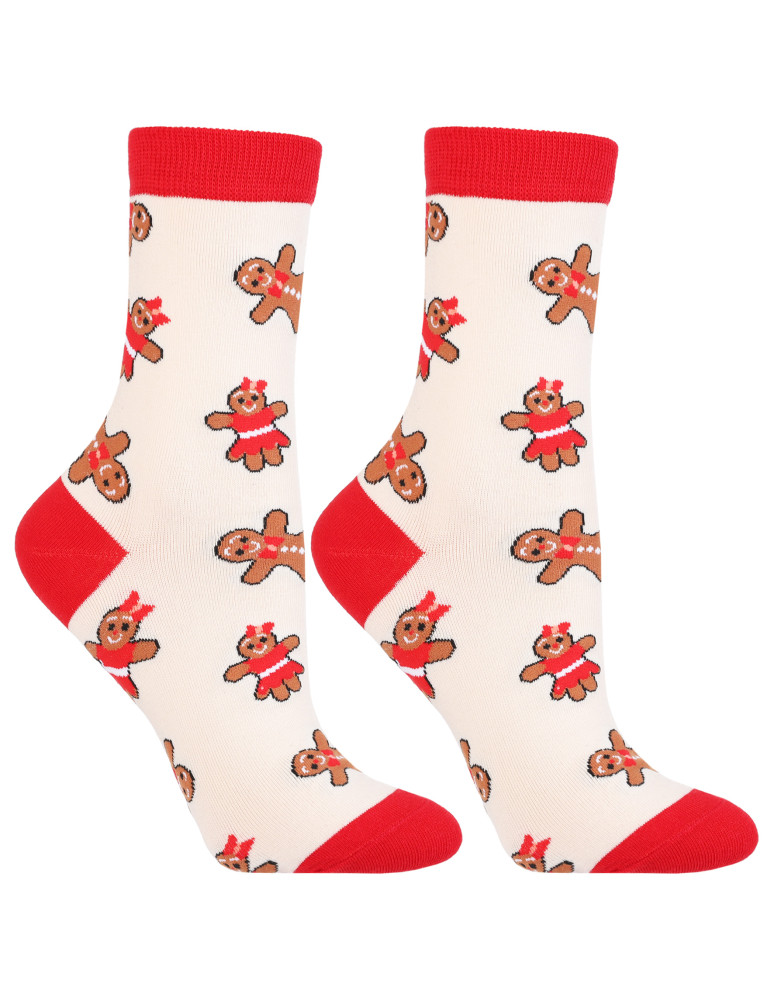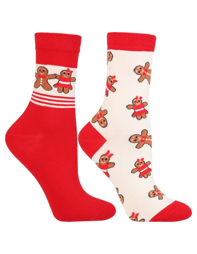 Urocze długie skarpetki damskie w świąteczne wzory z motywem pierniczków - idealne na zimowe dni! W zestawie znajdują się dwie różne pary: jedna w kolorze kremowym z postaciami piernikowej pary, druga w czerwieni z zabawnym, świątecznym nadrukiem. Całość zapakowana z ozdobną kokardką, dzięki czemu skarpetki świetnie sprawdzą się także jako prezent.
