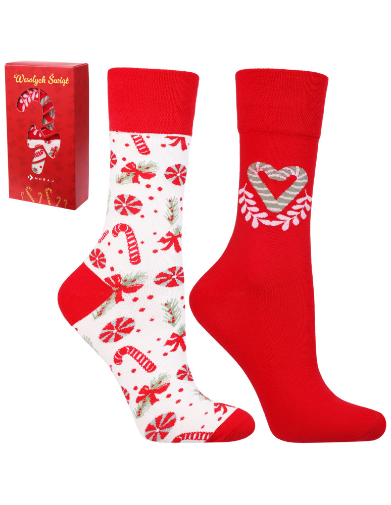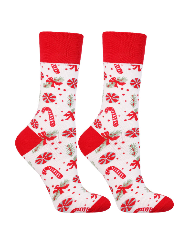 Dodaj magii do swoich świątecznych stylizacji dzięki uroczym damskim skarpetkom w laski cukrowe! Ten wyjątkowy zestaw to doskonałe połączenie klasycznych motywów bożonarodzeniowych. Dwie różne pary w zestawie – jedna z wzorem laski cukrowej, słodkości i świątecznych gałązek, a druga w jednolitym czerwonym kolorze z sercem ułożonym z cukrowych lasek – tworzą idealny komplet zarówno na świąteczne spotkania, jak i codzienne noszenie w grudniowe dni.