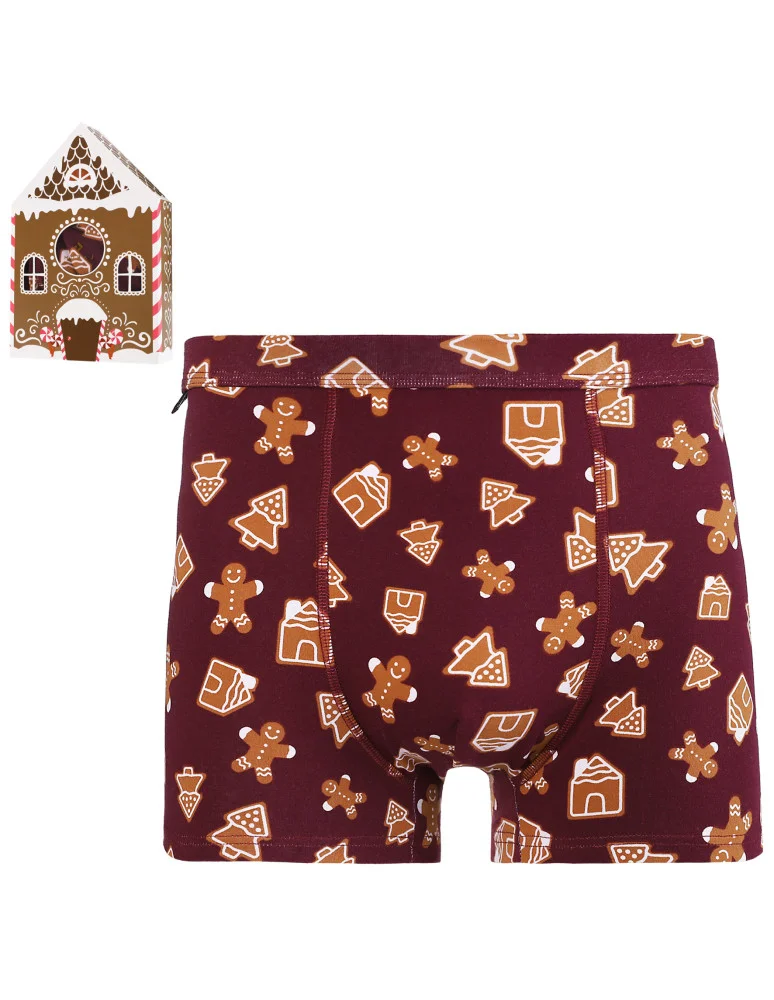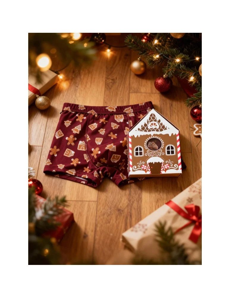 Wprowadź do swojej bieliźniarki odrobinę świątecznej radości z tymi wyjątkowymi męskimi bokserkami. Klasyczny krój zapewnia komfort i dopasowanie, a głęboki bordowy kolor ozdobiony uroczymi grafikami piernikowych ludzików, domków i choinek nadaje im wyjątkowy charakter. Całość zapakowana jest w efektowne, świąteczne opakowanie w kształcie piernikowej chatki, idealne na prezent.