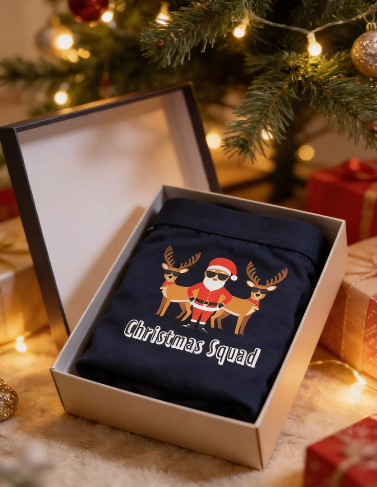Świąteczne bokserki męskie w granatowym kolorze, wykonane z miękkiej i elastycznej dzianiny bawełnianej z dodatkiem elastanu. Klasyczny, dopasowany krój zapewnia wygodę i swobodę ruchów na co dzień. Przód ozdobiony zabawnym nadrukiem przedstawiającym Mikołaja w okularach przeciwsłonecznych i dwa renifery – idealne na prezent lub jako element świątecznej stylizacji z przymrużeniem oka.