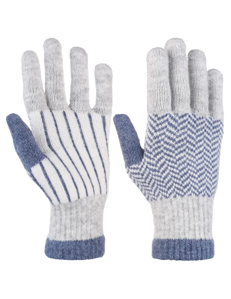 Wykonane z miękkiej i ciepłej dzianiny, zapewniają dłoniom przyjemne otulenie i ochronę przed zimnem. Ich unikalny design polega na połączeniu dwóch różnych wzorów: tył dłoni zdobi modna jodełka (chevron), a spód dłoni utrzymany jest w kontrastowych pasach, co nadaje im niepowtarzalnego charakteru. Elastyczny ściągacz w mankiecie zapewnia idealne dopasowanie i zapobiega wnikaniu chłodu.
