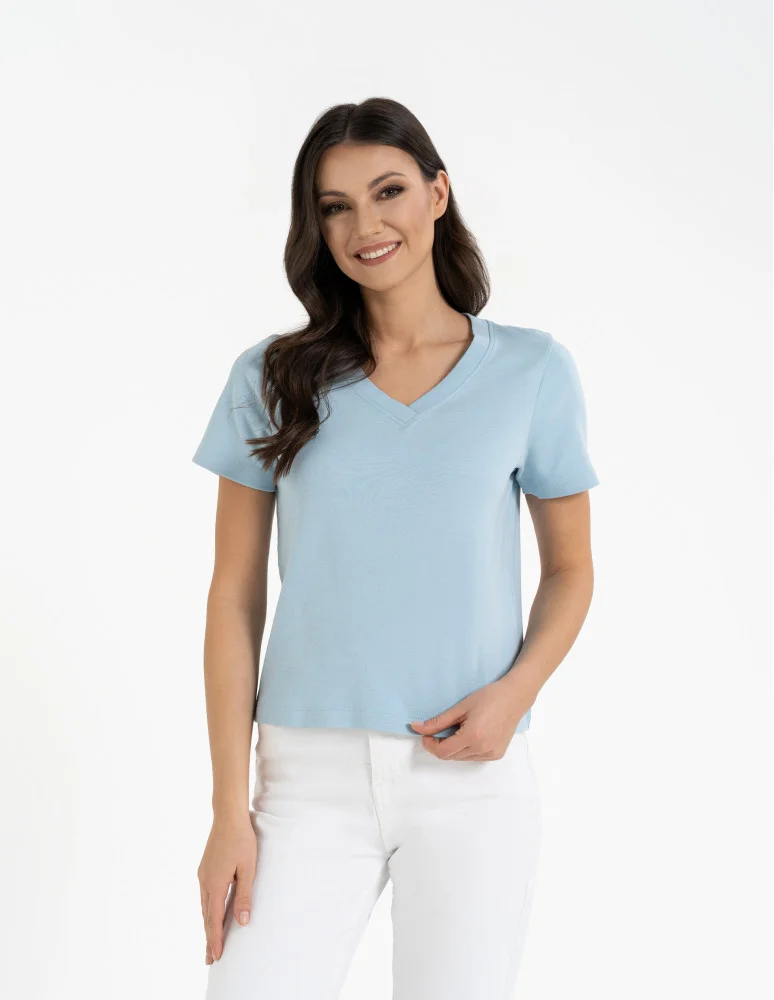 T-shirt damski z dekoltem w serek z dzianiny NIEBIESKI
