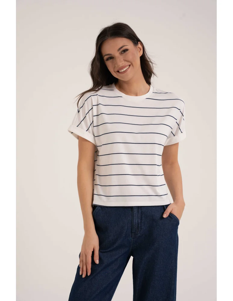 Ta bluzka damska w paski to propozycja, która łączy komfort z klasycznym stylem. Wykonana z wysokiej jakości wiskozy, jest lekka i przewiewna, co zapewnia wygodę przez cały dzień. Luźniejszy krój gwarantuje swobodę ruchów, a podwinięty rękaw dodaje jej nowoczesnego charakteru. Paski w stonowanych kolorach to ponadczasowy wzór, który pasuje do wielu stylizacji – zarówno do dżinsów, jak i spódnic, tworząc idealny look na co dzień. To uniwersalny element, który sprawdzi się w wielu okazjach.