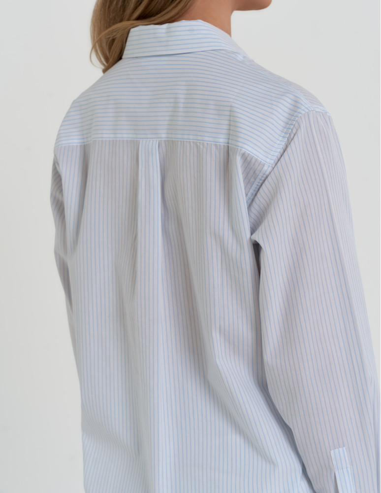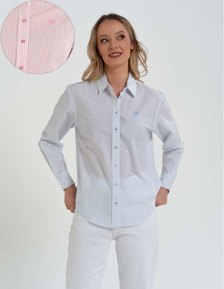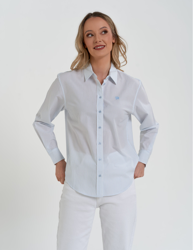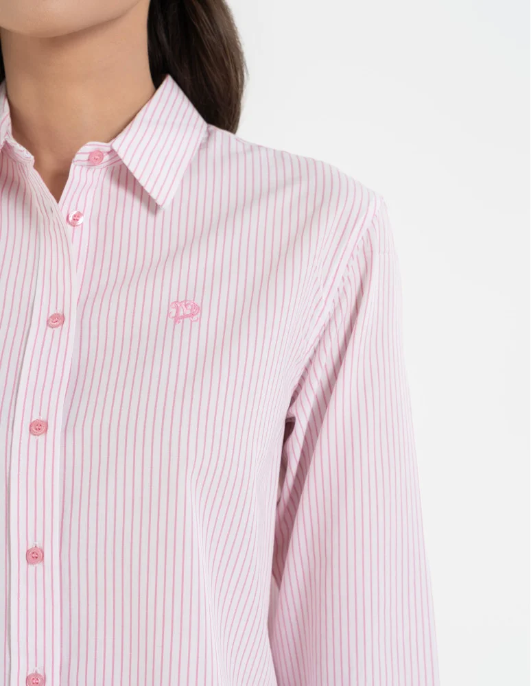 Model o ponadczasowym fasonie z kołnierzykiem i zapięciem na guziki. Delikatny wzór w pionowe paski optycznie wysmukla sylwetkę i nadaje koszuli lekkości. Długie rękawy zakończone mankietem z guzikami podkreślają elegancki charakter, a subtelne logo na piersi stanowi estetyczny detal wykończeniowy.