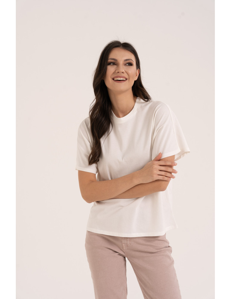 Ta luźna koszulka damska to doskonała propozycja na ciepłe dni, gdy komfort i styl idą w parze. Wykonana w 100% z bawełny, jest miękka w dotyku i zapewnia wygodę przez cały dzień. Krój o swobodnej formie daje poczucie lekkości, a klasyczny krótki rękaw sprawia, że jest to idealna baza do wielu letnich stylizacji. Uniwersalny fason i naturalny materiał sprawiają, że koszulka doskonale sprawdzi się zarówno w casualowych zestawach, jak i w bardziej eleganckich połączeniach. Połączenie jakości i prostoty, które świetnie komponuje się z każdą częścią garderoby.