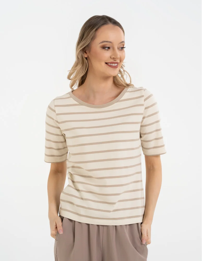 Bluzka damska bawełniana w paski z krótkim rękawem BEŻOWY