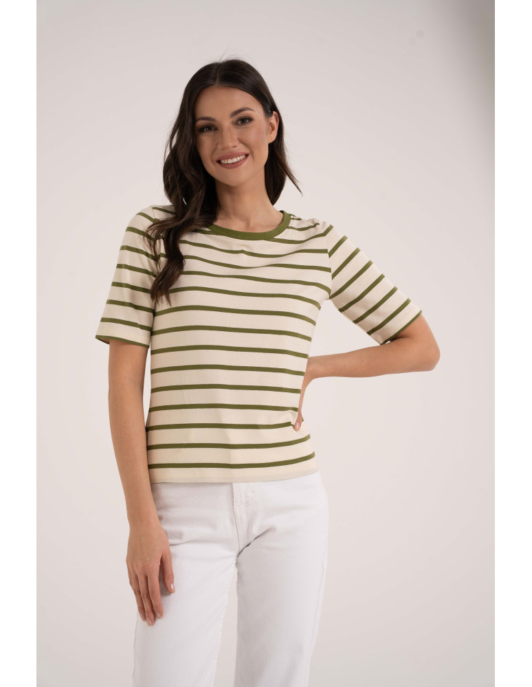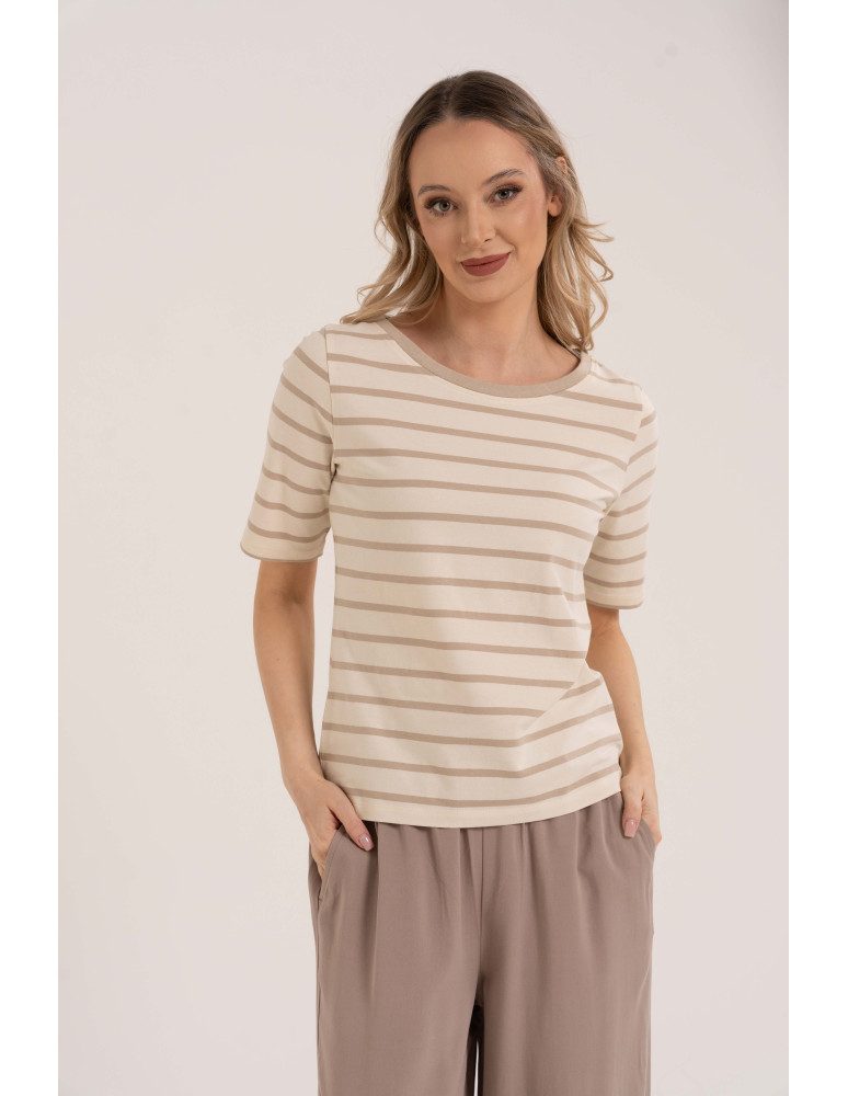 Damska bluzka w paski to uniwersalna baza do codziennych stylizacji, która łączy wygodę z ponadczasowym stylem. Wykonana z wysokiej jakości bawełny z dodatkiem elastanu, jest miękka, oddychająca i przyjemna dla skóry, a jednocześnie delikatnie elastyczna, dzięki czemu dobrze dopasowuje się do sylwetki. Klasyczny krój i krótki rękaw zapewniają komfort noszenia przez cały dzień, a wzór w paski dodaje lekkości i sprawia, że bluzka łatwo komponuje się zarówno z jeansami, jak i bardziej casualowymi elementami garderoby.