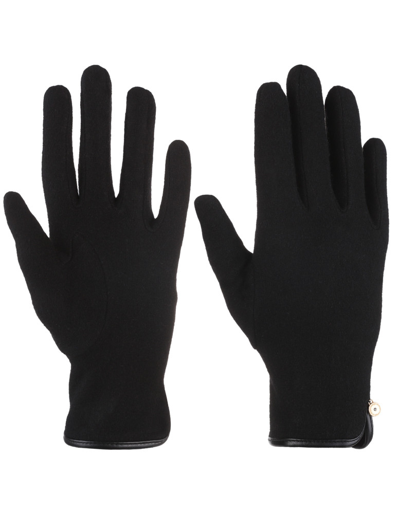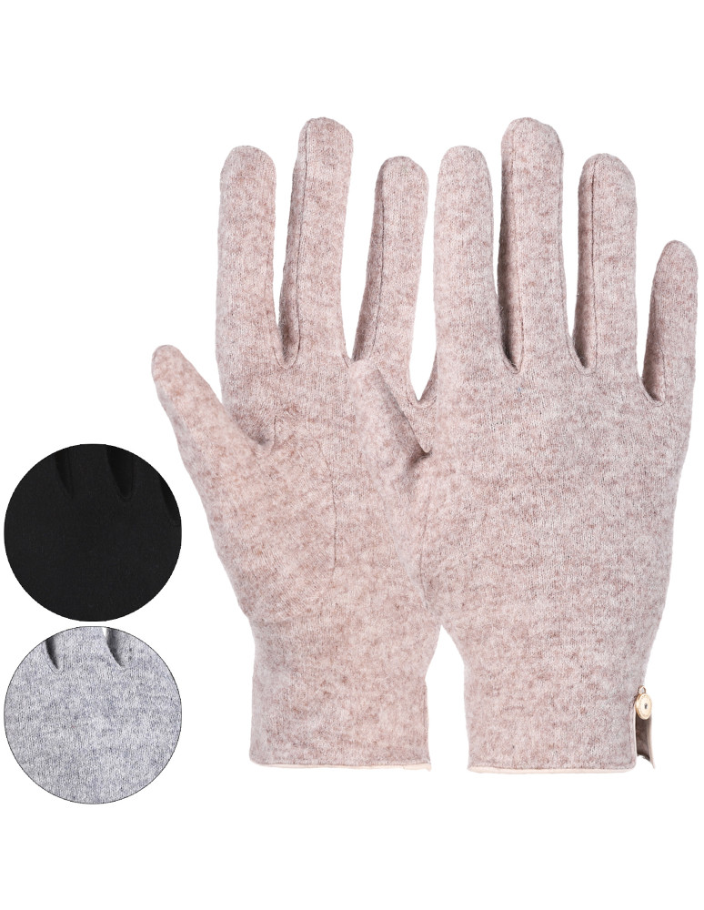 Klasyczne damskie rękawiczki wykonane z miękkiej tkaniny z dodatkiem naturalnej wełny, która zapewnia ciepło i komfort w chłodniejsze dni. Gładki wzór na wierzchu sprawia, że są one uniwersalne i ponadczasowe, idealne zarówno do casualowych, jak i bardziej eleganckich stylizacji. Dodatkowym akcentem jest dekoracyjny guziczek umieszczony przy mankiecie i wykończenie z eko-skóry, dodaje subtelnego uroku.