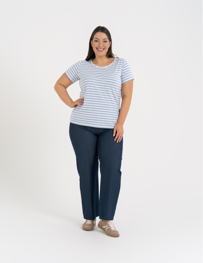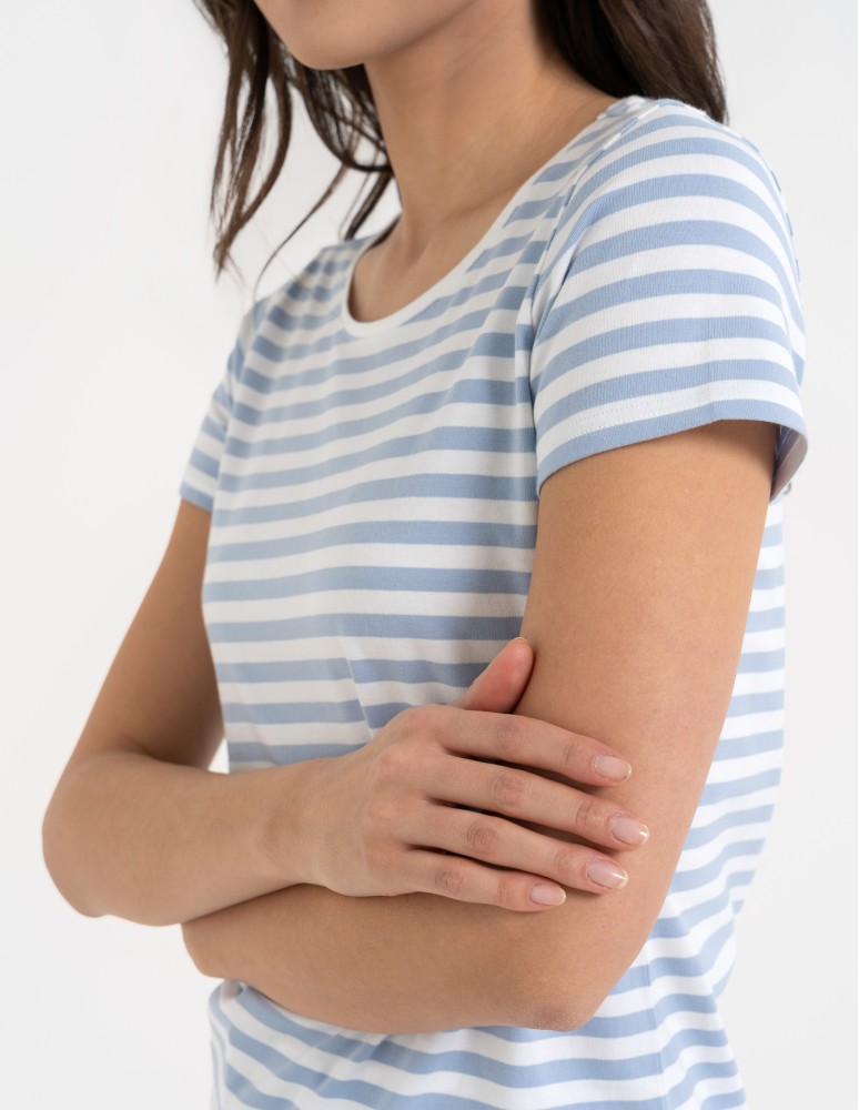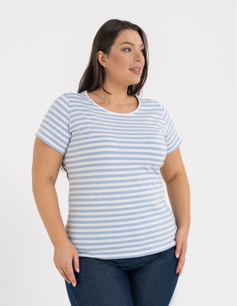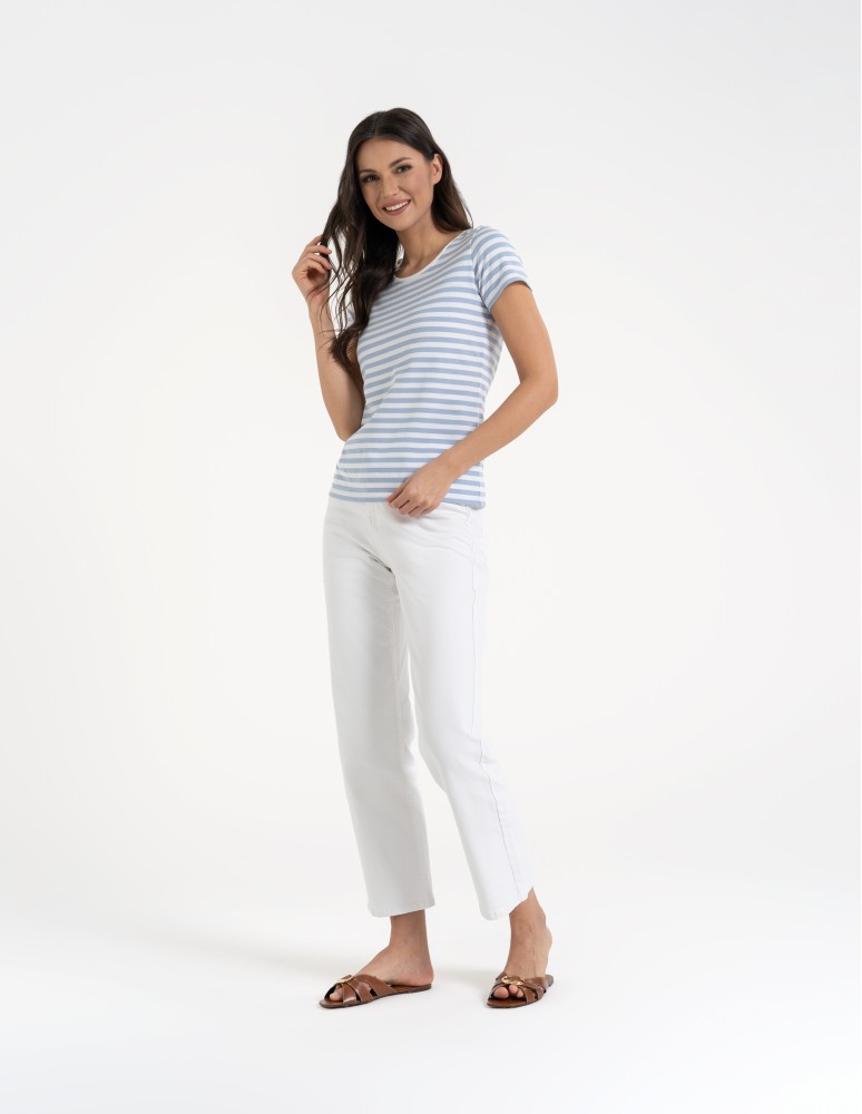 Klasyczny fason z krótkim rękawem i okrągłym dekoltem sprawia, że model ten jest bazą do wielu stylizacji – idealny do jeansów, białych spodni czy letnich szortów.