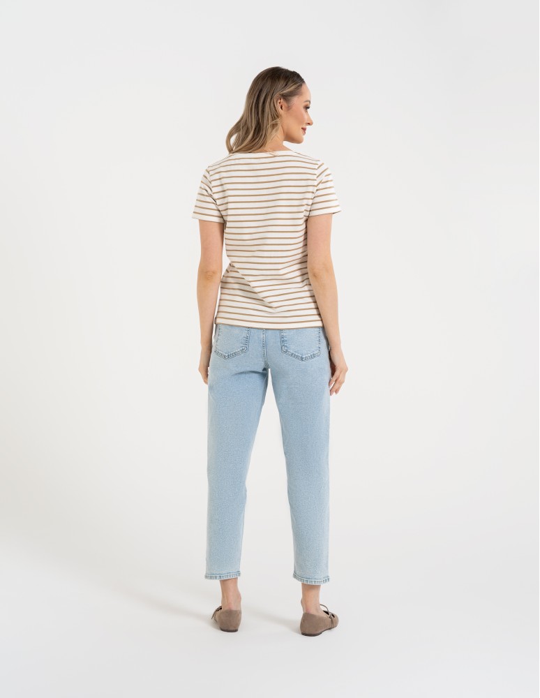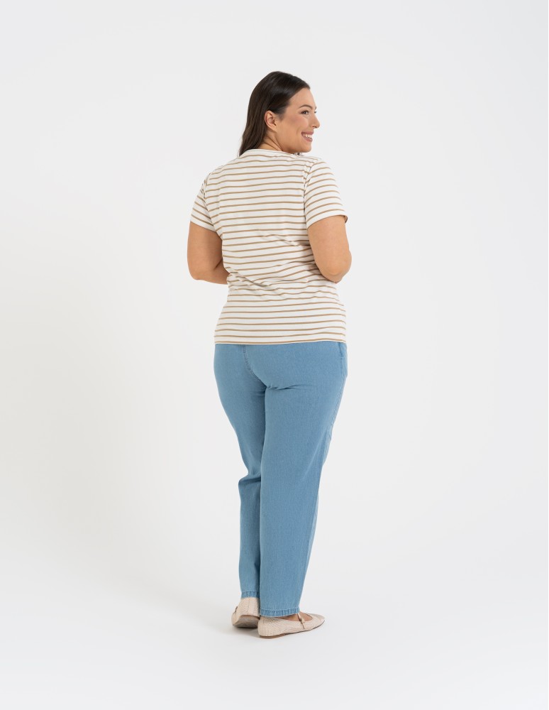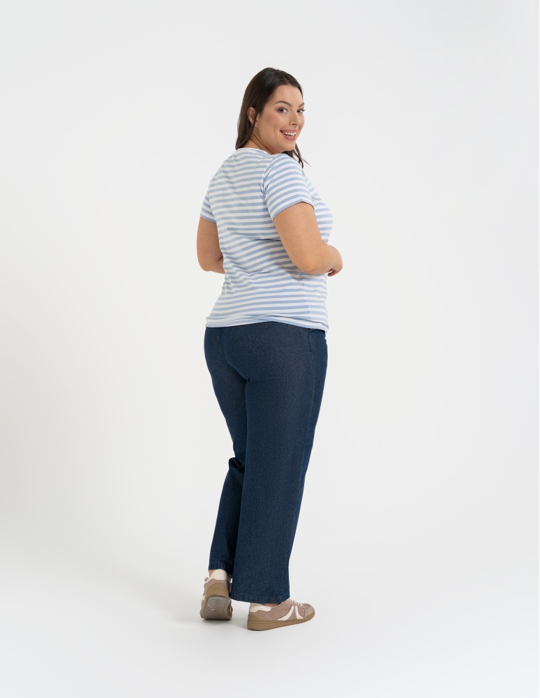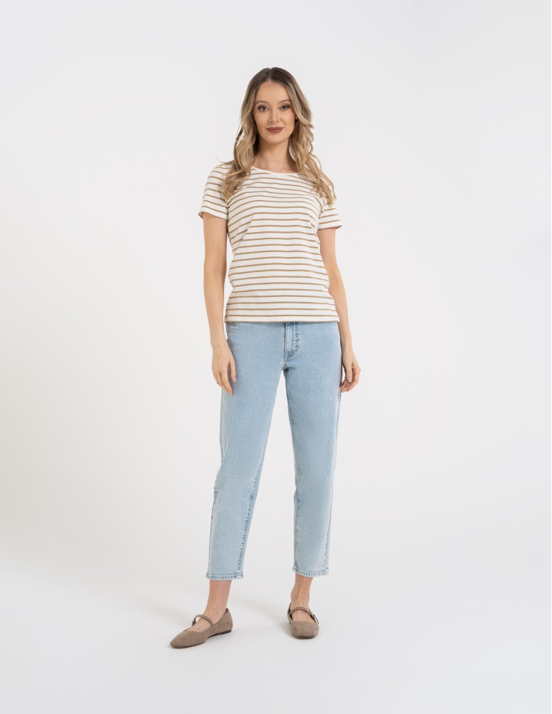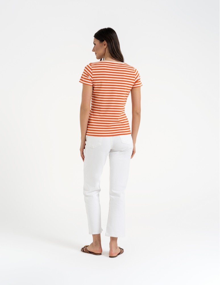 Klasyczny fason z krótkim rękawem i okrągłym dekoltem sprawia, że model ten jest bazą do wielu stylizacji – idealny do jeansów, białych spodni czy letnich szortów.