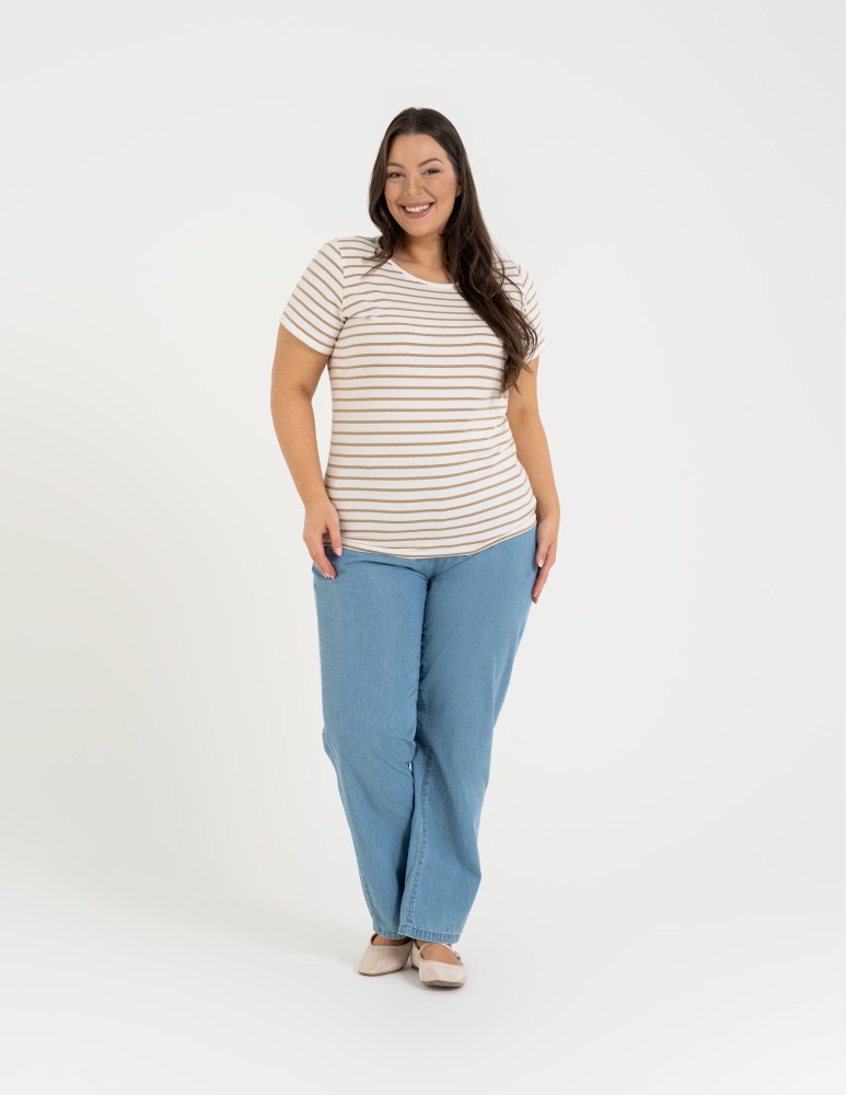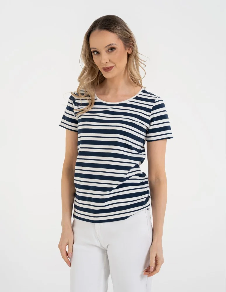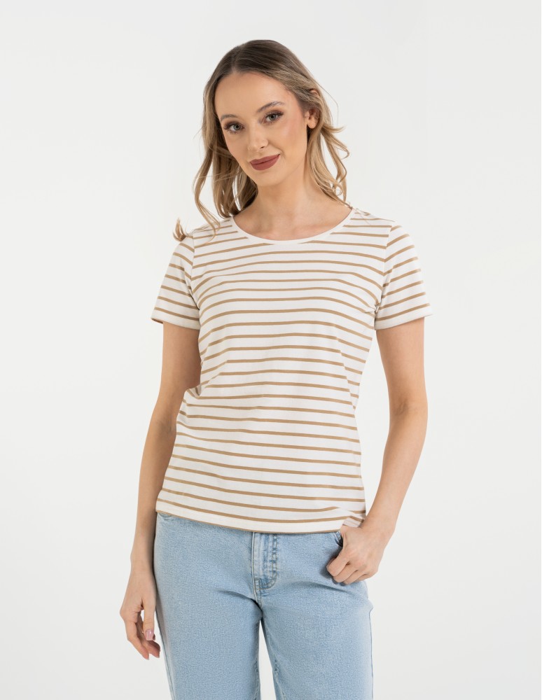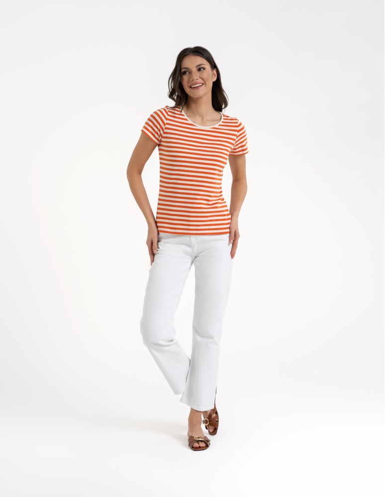 Ponadczasowa klasyka w nowoczesnym wydaniu. Damski t-shirt w paski to uniwersalna propozycja dla kobiet ceniących wygodę i styl. Połączenie białego tła z ciepłymi odcieniami pasków tworzy świeży, harmonijny look, który sprawdzi się zarówno w codziennych stylizacjach, jak i w bardziej casualowych zestawach.