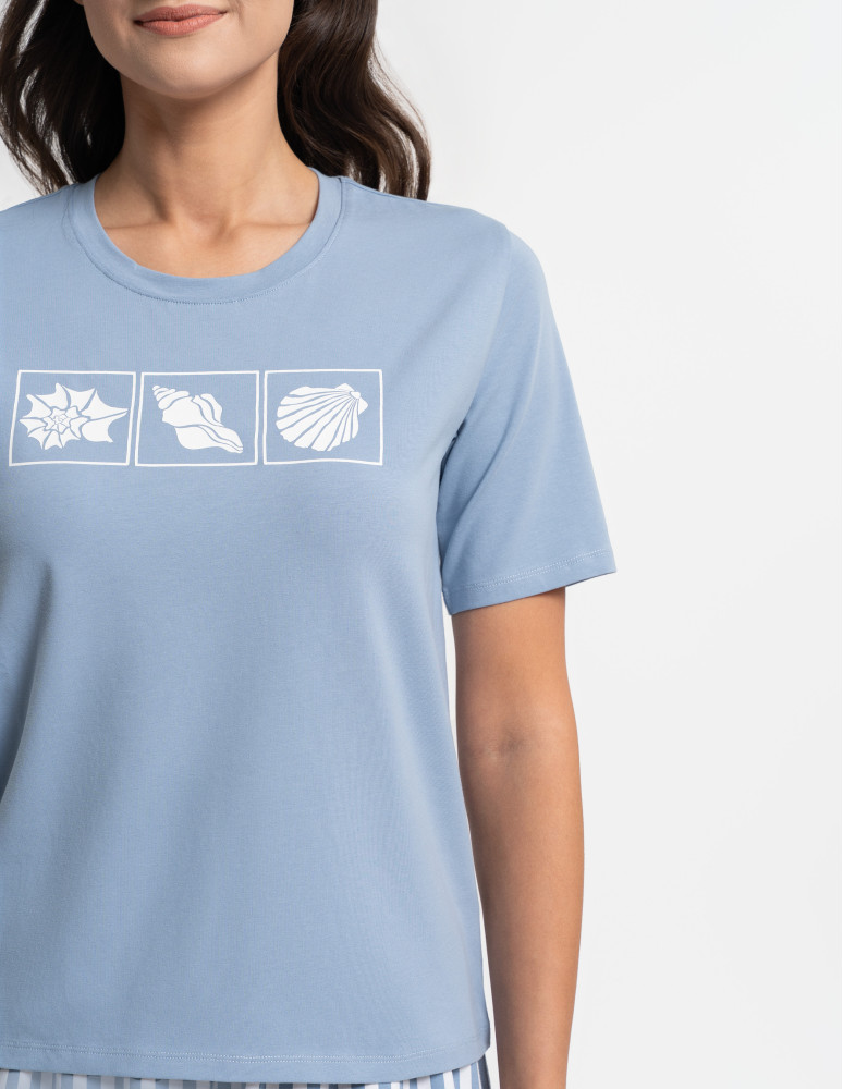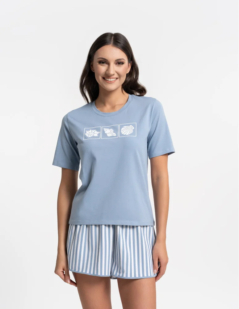 Piżama damska z krótkim rękawem w motyw morski NIEBIESKI