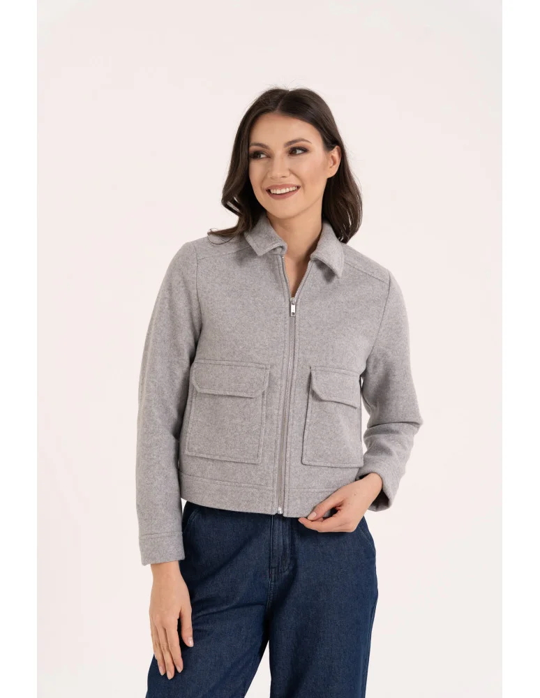 Kurtka damska bomberka z kołnierzem i kieszeniami z przodu SZARY MELANŻ