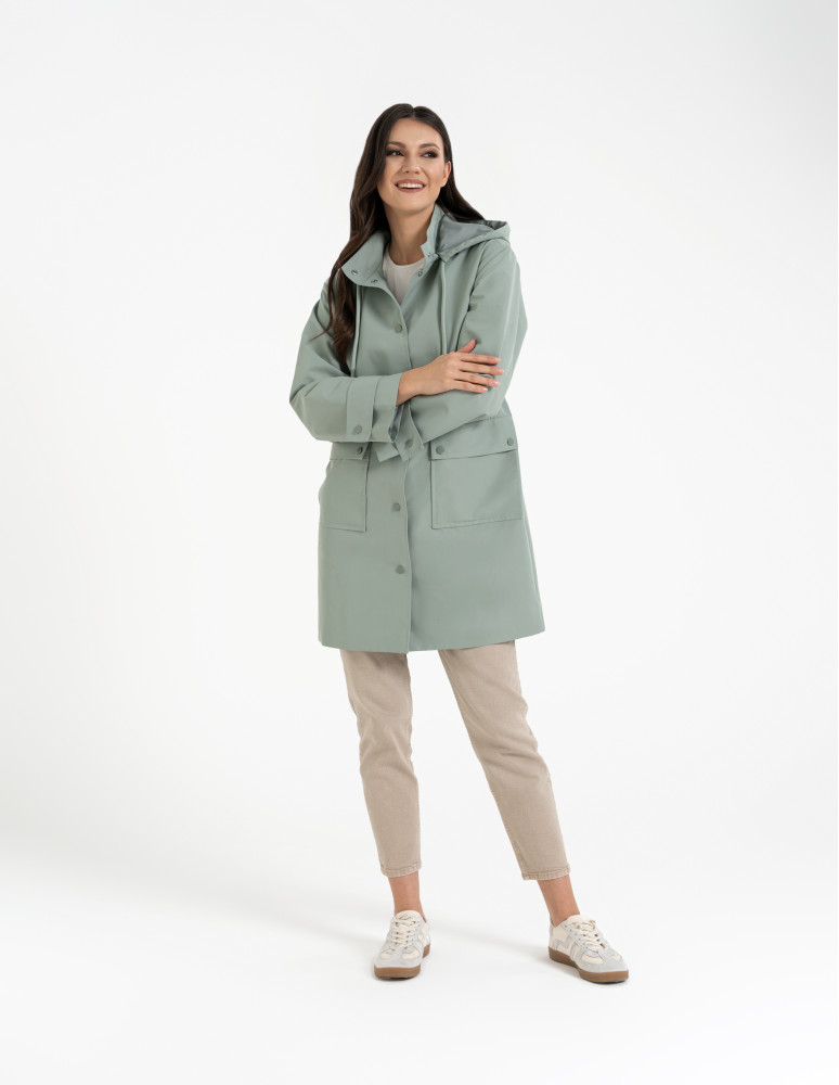Model wyposażony jest w regulowany kaptur i zapięcie na napy, które zwiększają ochronę przed wiatrem. Regulacja w pasie pozwala dopasować kurtkę do sylwetki, podkreślając kobiecy krój, a pojemne kieszenie z przodu dodają jej funkcjonalności i miejskiego charakteru.