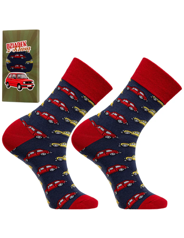 Wzór z kultowymi maluchami w czerwonym i żółtym kolorze dodaje im wyjątkowego charakteru, a eleganckie pudełko z grafiką samochodu i napisem „Dziadek z klasą” sprawia, że to gotowy prezent do wręczenia – bez potrzeby dodatkowego pakowania.
