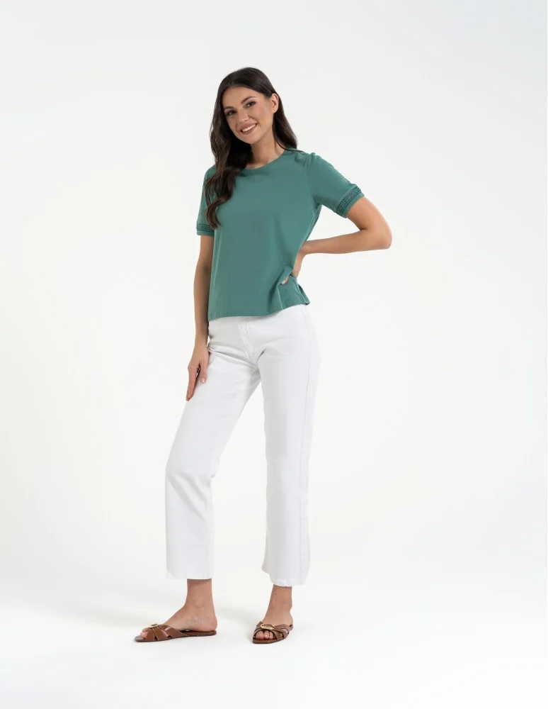 Gładki fason bez wzoru sprawia, że koszulka jest uniwersalną bazą do wielu stylizacji – zarówno casualowych, jak i bardziej kobiecych zestawów. Delikatny, koronkowy detal na rękawie dodaje jej lekkości i wyjątkowego charakteru, podkreślając subtelny styl. Dłuższy rękawek zapewnia większy komfort i delikatnie osłania ramiona.