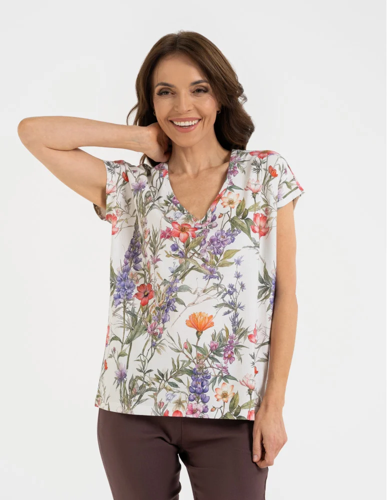Bluzka damska z krótkim rękawem i roślinnym motywem WZÓR 1