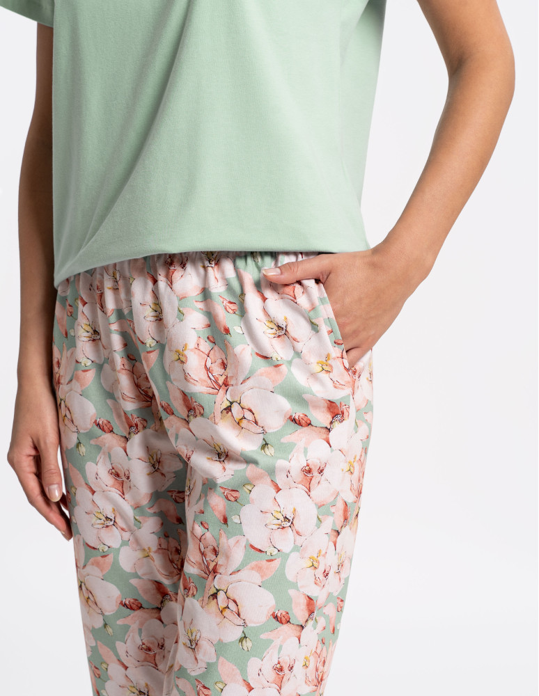 Piżama została uzupełniona o spodnie 3/4 z delikatnym, kwiatowym nadrukiem, które pasują do całości stylizacji. Elastyczny pas zapewnia komfort noszenia, a materiał idealnie dopasowuje się do sylwetki, nie krępując ruchów. Doskonała zarówno na ciepłe noce, jak i leniwe poranki, kiedy liczy się komfort i styl.