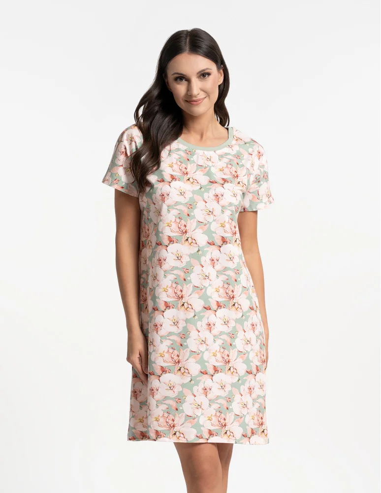 Koszula nocna damska bawełniana w kwiaty z elastanem ZIELONY
