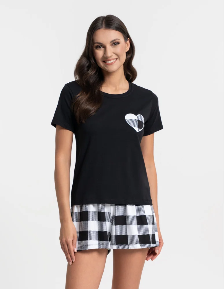 Piżama damska z krótkim rękawem w kratkę CZARNY