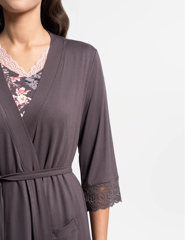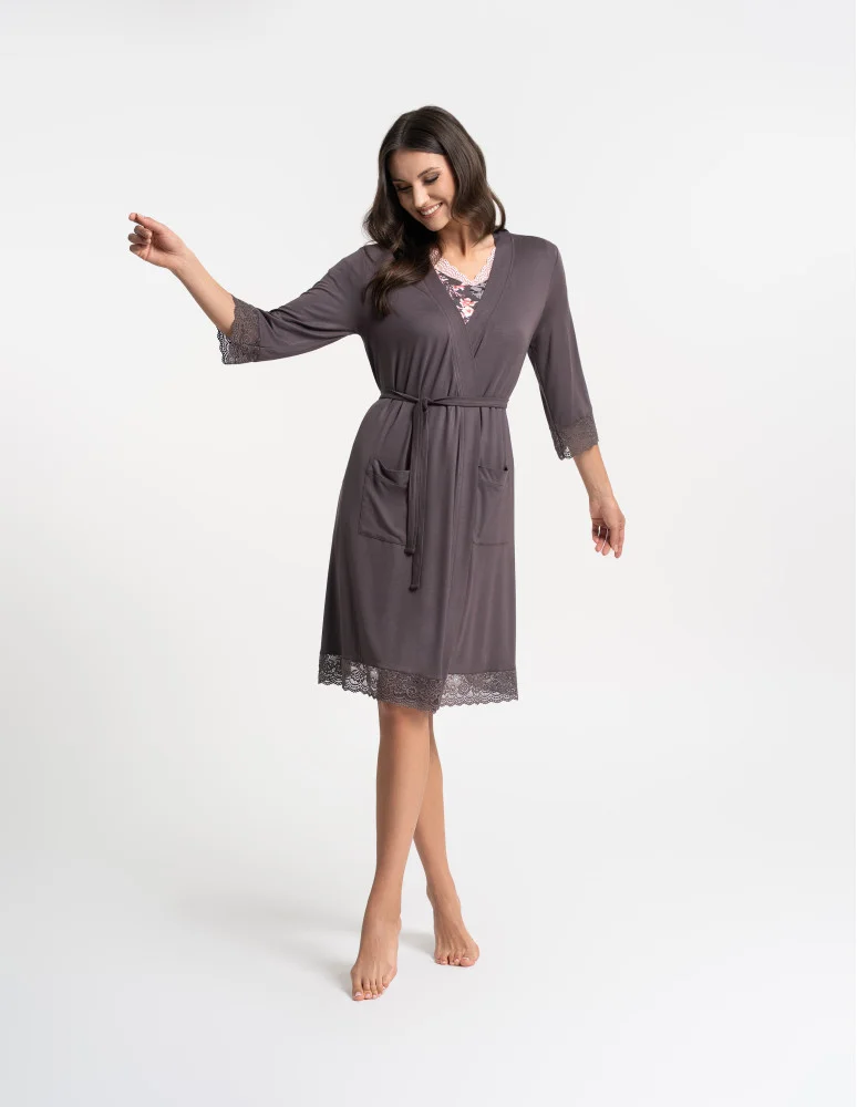 Ten damski szlafrok to połączenie lekkości, wygody i kobiecej formy. Wykonany z dzianiny zawierającej 95% wiskozy i 5% elastanu, jest miękki, przewiewny i przyjemny w dotyku, dzięki czemu doskonale sprawdza się podczas codziennego wypoczynku w domu. Dodatek elastanu zapewnia elastyczność i swobodę ruchów, a luźniejszy krój pozwala na komfortowe noszenie zarówno rano, jak i wieczorem. Model wyposażono w rękawy o długości 3/4 oraz praktyczne kieszenie, a subtelne koronkowe wykończenia przy mankietach i u dołu nadają całości eleganckiego, dopracowanego charakteru. Szlafrok wiązany w pasie umożliwia indywidualne dopasowanie do sylwetki.