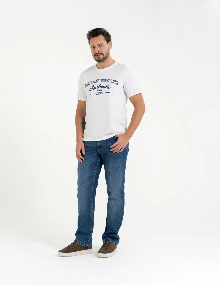 Męska koszulka o klasycznym kroju regular, wykonana w 100% z wysokiej jakości bawełny. Naturalny materiał jest miękki, oddychający i przyjazny dla skóry, dzięki czemu koszulka sprawdzi się w codziennym użytkowaniu – zarówno w cieplejsze dni, jak i jako baza pod bluzę czy kurtkę. Klasyczna linia zapewnia wygodne dopasowanie do sylwetki, a nadruk na przodzie nadaje całości casualowego, uniwersalnego charakteru. To ponadczasowy element męskiej garderoby, który łatwo zestawić z jeansami lub spodniami materiałowymi.