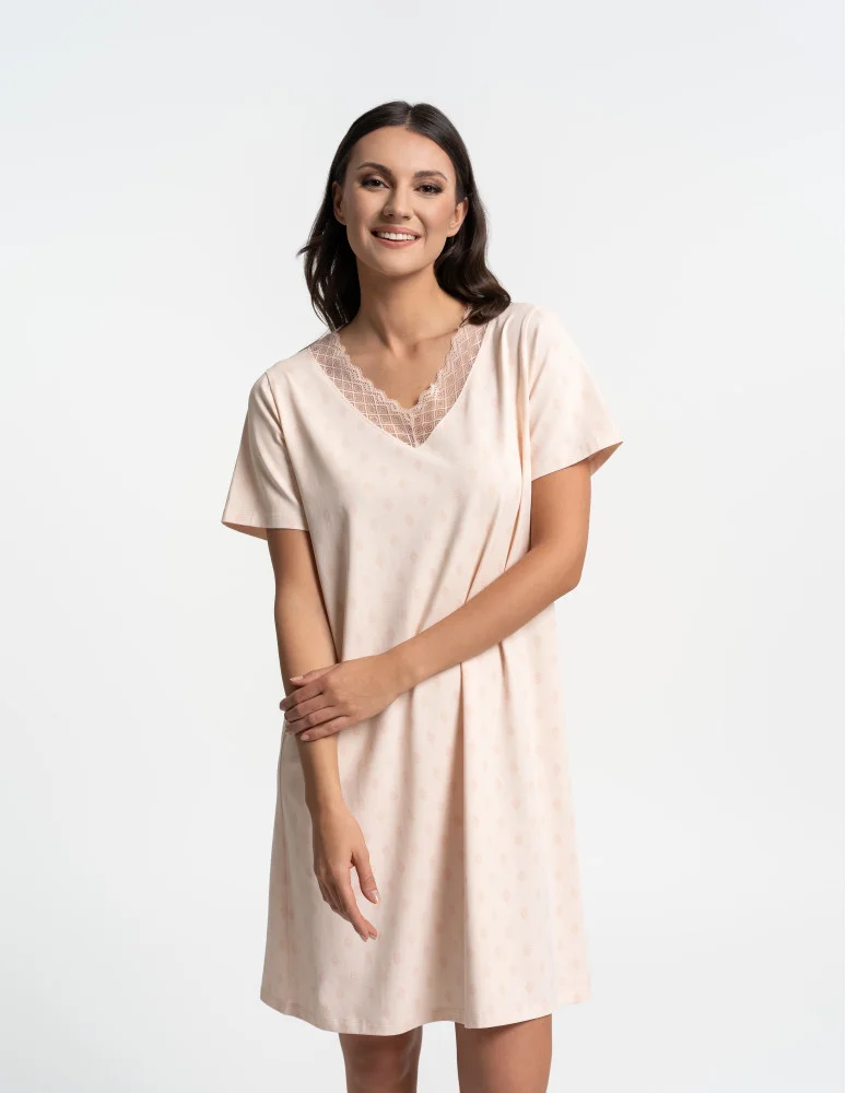 Koszula posiada krótki rękaw oraz dekolt w serek, ozdobiony delikatną, kobiecą koronką, która nadaje całości lekkości i elegancji. Prosty, swobodny fason zapewnia pełną swobodę ruchów i komfort noszenia przez całą noc. Subtelny, drobny wzór w połączeniu z jasnym, pudrowym odcieniem tworzy ponadczasową i harmonijną całość.