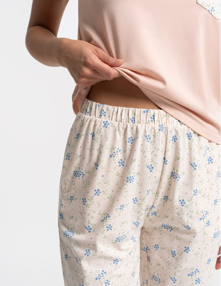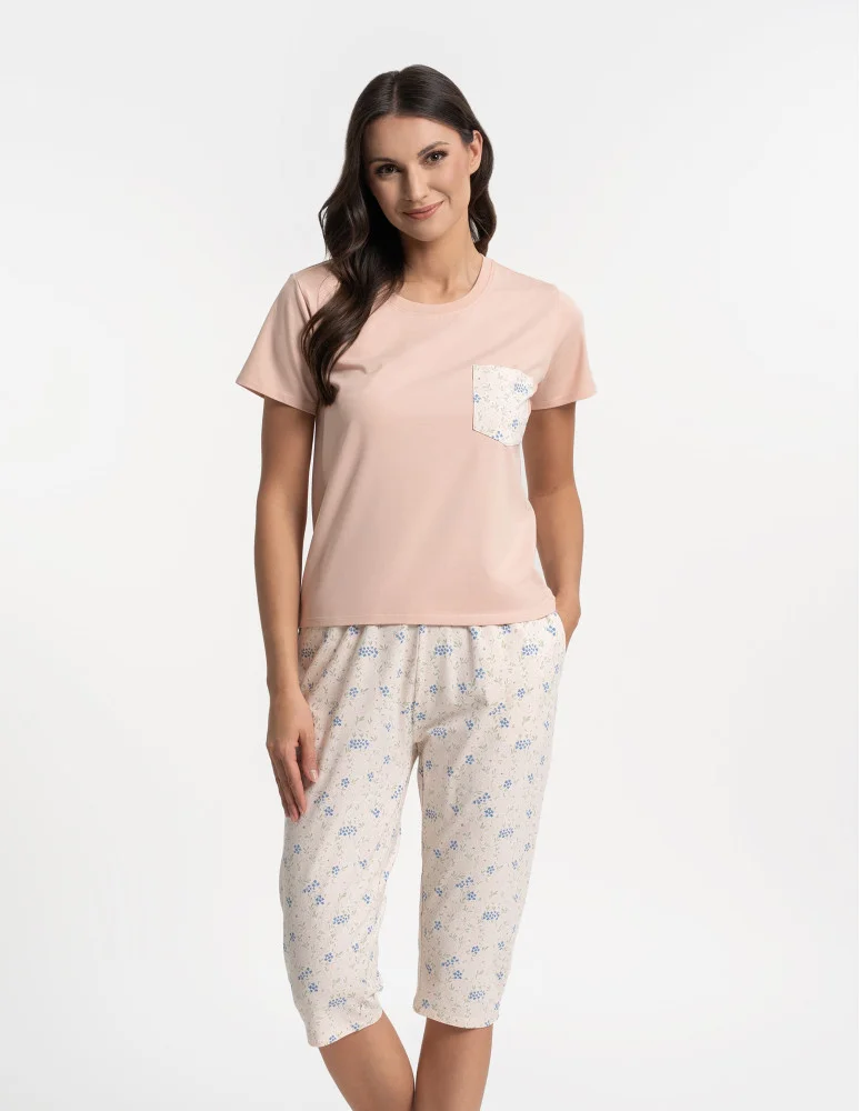 Piżama damska to połączenie wygody, kobiecego stylu i subtelnych detali, które sprawdzą się idealnie zarówno podczas snu, jak i domowego relaksu. Zestaw składa się z gładkiej koszulki z kieszonką i krótkim rękawem oraz spodni o długości 3/4 z delikatnym, kwiatowym wzorem.