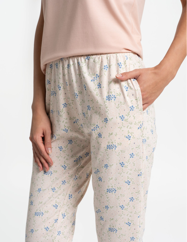 Piżama damska z krótkim rękawem bawełniana w kwiaty BEŻOWY