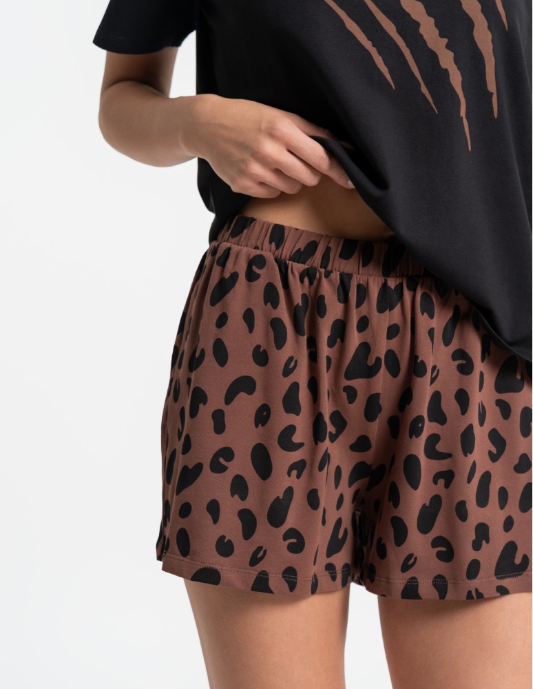 Zestaw składa się z koszulki z krótkim rękawem oraz luźnych szortów. Koszulka posiada klasyczny okrągły dekolt oraz nadruk inspirowany motywem zwierzęcym, który nadaje całości nowoczesnego charakteru. Szorty wyróżniają się modnym zwierzęcym printem, a ich luźny fason zapewnia wygodę noszenia. Dodatkowym atutem są praktyczne kieszonki po bokach, które zwiększają funkcjonalność zestawu.