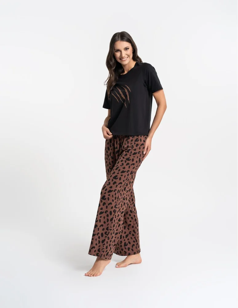 Koszulka posiada klasyczny, okrągły dekolt oraz nadruk inspirowany motywem zwierzęcym, który nadaje całości modnego charakteru. Długie spodnie wyróżniają się efektownym zwierzęcym wzorem, który dodaje piżamie wyrazistego stylu. W pasie zastosowano elastyczną gumkę oraz praktyczne wiązanie, dzięki czemu spodnie dobrze dopasowują się do sylwetki. Dodatkowym atutem są funkcjonalne kieszenie po bokach.