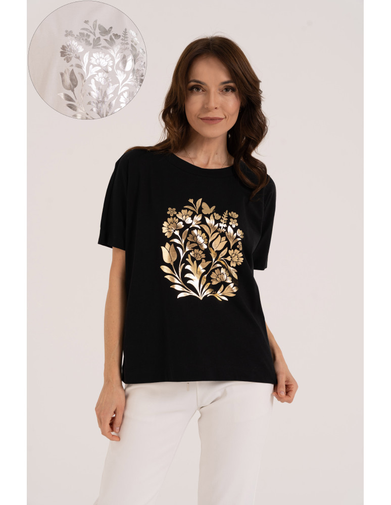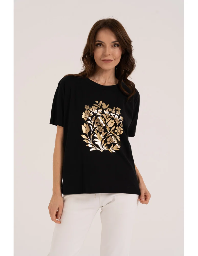 Bluzka damska z krótkim rękawem z eleganckim printem CZARNY