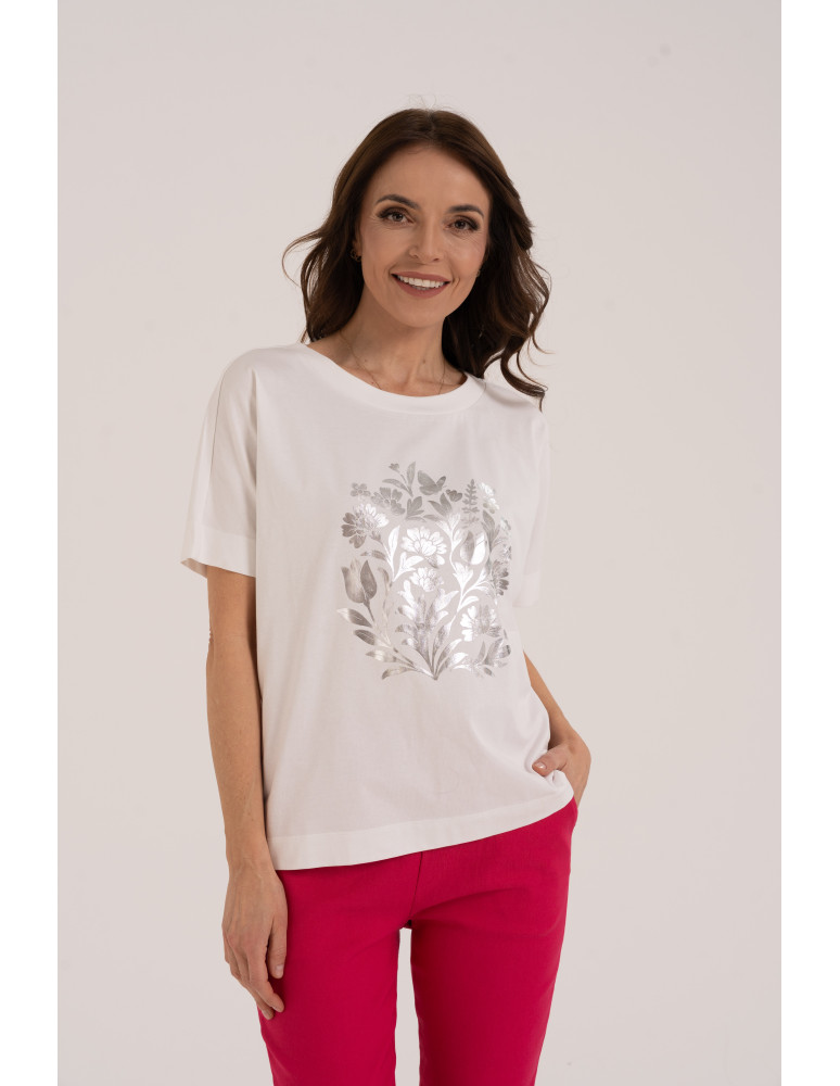Centralnym punktem modelu jest efektowny, roślinny print wykonany elegancką metodą foil. Subtelny połysk dodaje bluzce szyku i sprawia, że doskonale sprawdzi się zarówno w codziennych stylizacjach, jak i w bardziej wyjściowych zestawach.