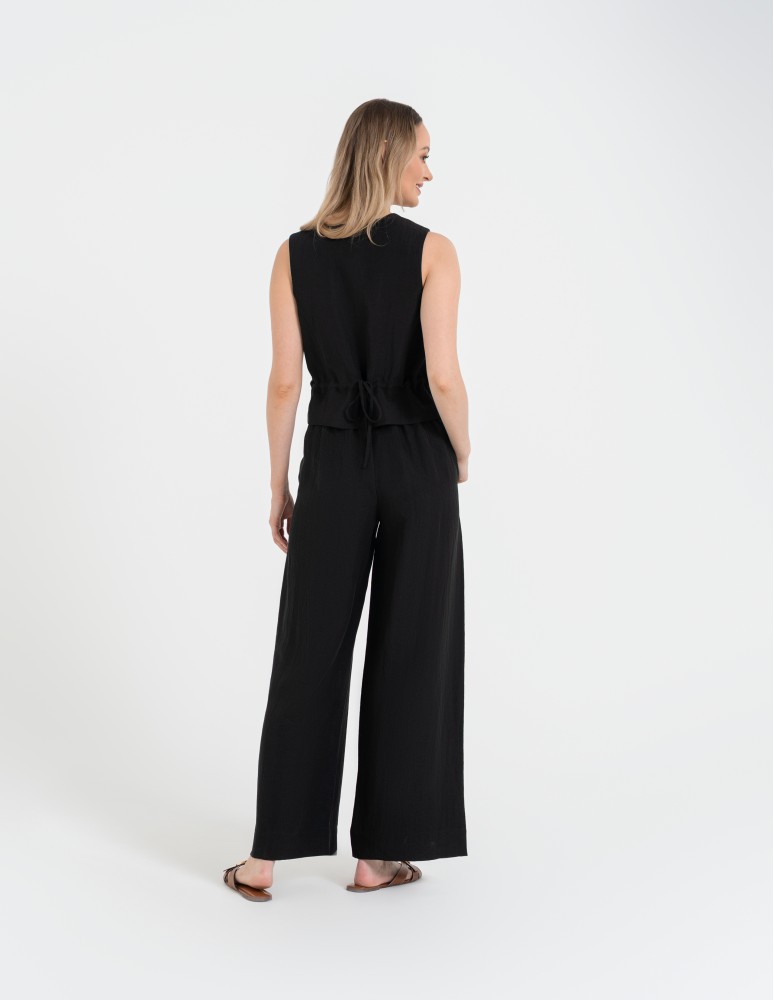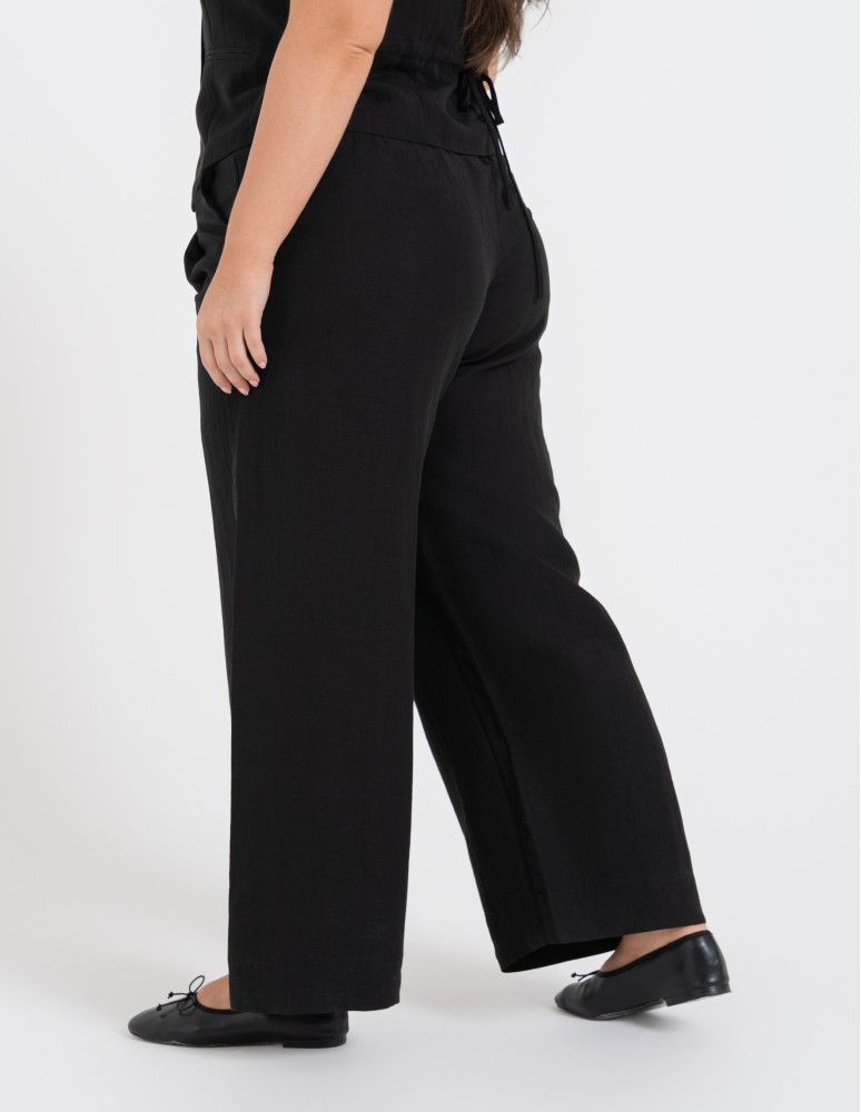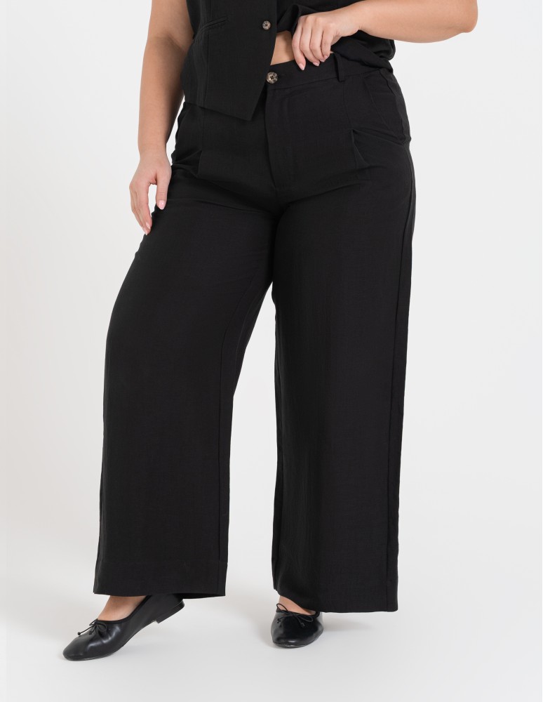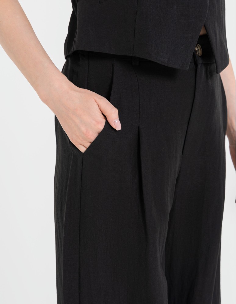 Te spodnie to baza do stworzenia spektakularnego total looku – połącz je z naszą dedykowaną kamizelką z tej samej serii, aby uzyskać efekt nowoczesnego, lnianego garnituru. W wydaniu biznesowym zestaw je z dopasowaną białą koszulą i czółenkami, natomiast w wersji casualowej postaw na dopasowany top i skórzane klapki lub sandały. Szeroka nogawka doskonale współpracuje z ruchem, nadając Twojej stylizacji lekkości i szlachetnego charakteru.