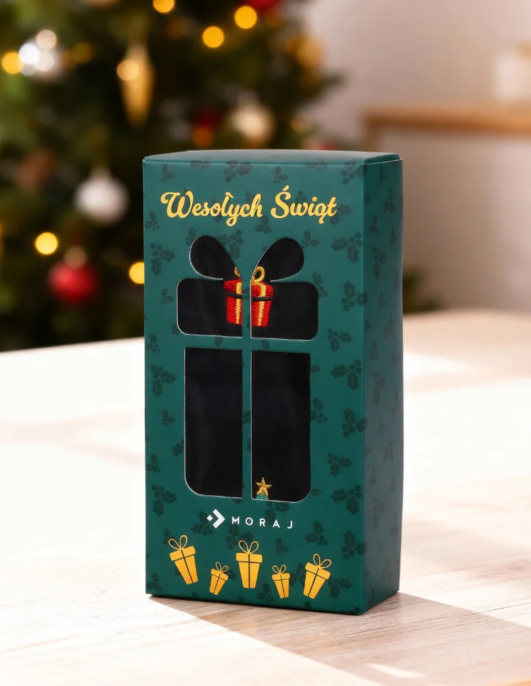 Spraw radość sobie lub bliskim dzięki świątecznemu zestawowi skarpet męskich w ozdobnym opakowaniu prezentowym. W skład kompletu wchodzą dwie pary klasycznych, czarnych skarpet z delikatnym haftem – jedna z choinką, druga z prezentem. Idealne zarówno jako dodatek do świątecznych stylizacji, jak i pomysł na drobny upominek.